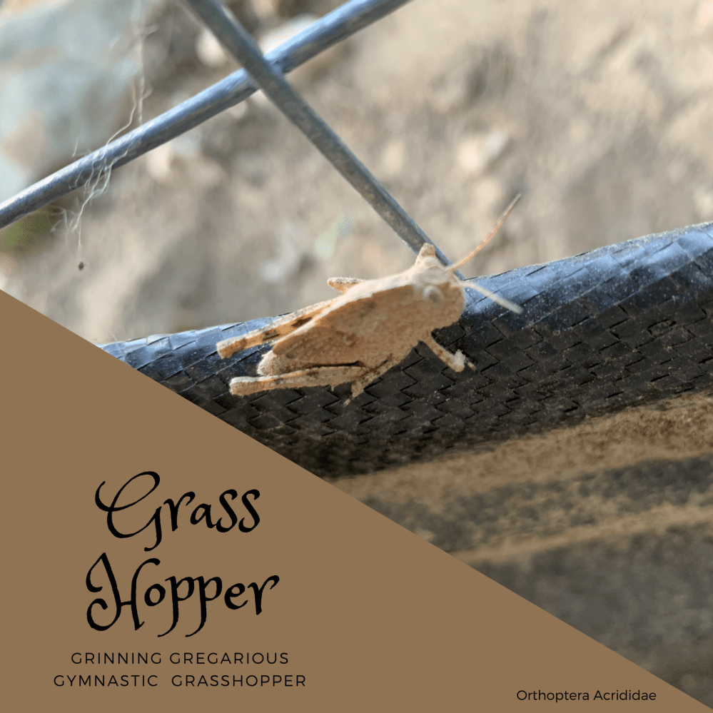 We have a few different types of grasshoppers that live in our backyard. We think of them as free toys for the dogs since they enjoy chasing them around, very rarely ever actually catching one. The stubby brown ones blend in perfectly with the dry dessert dusty areas while the larger grey ones tend to stick to the long dry grasses.