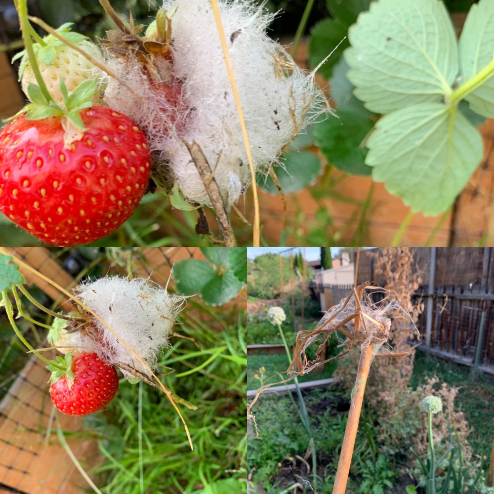 Our strawberries are still flowering and producing so we will leave them to continue growing into the fall. Unfortunately, there were a lot of rotten berries in the bed, so there are also now quite a few fruit flies. The good thing is the bed is as far away from the house as possible, so we shouldn’t have an issue with them inside. I grabbed all that I could to freeze for some jam making later this fall. We did however, turn off the water to this bed as it seems to be getting too much. We found a strawberry that had grown a coat of fur to keep itself warm. Yuck.