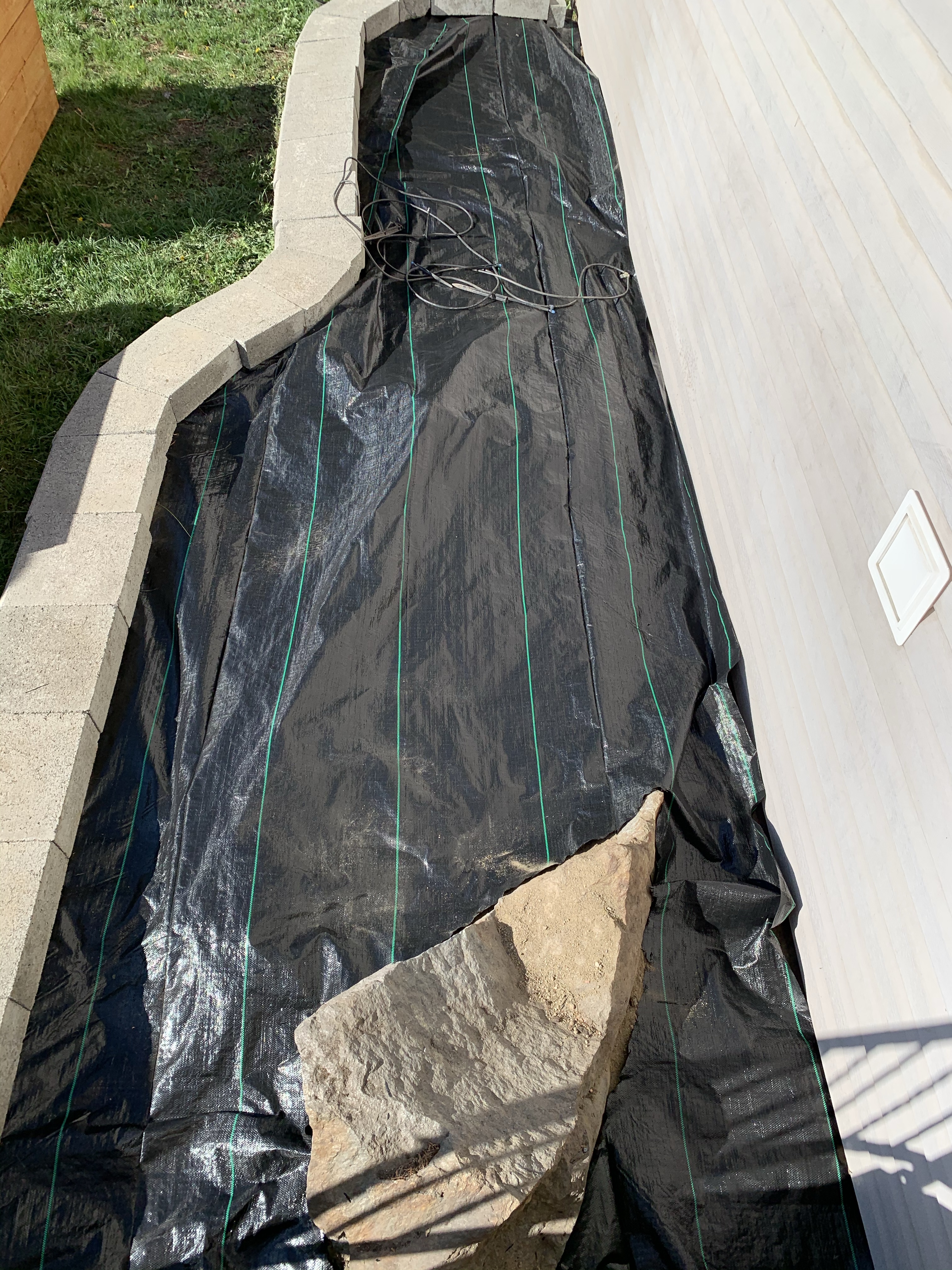 We found a large rock under some of the bushes when we tore them out, and we certainly didn’t want to and couldn’t move it from the garden, so we built it into our design. There was no way to pinch the fabric, so we just cut it as close as we could around the rock.