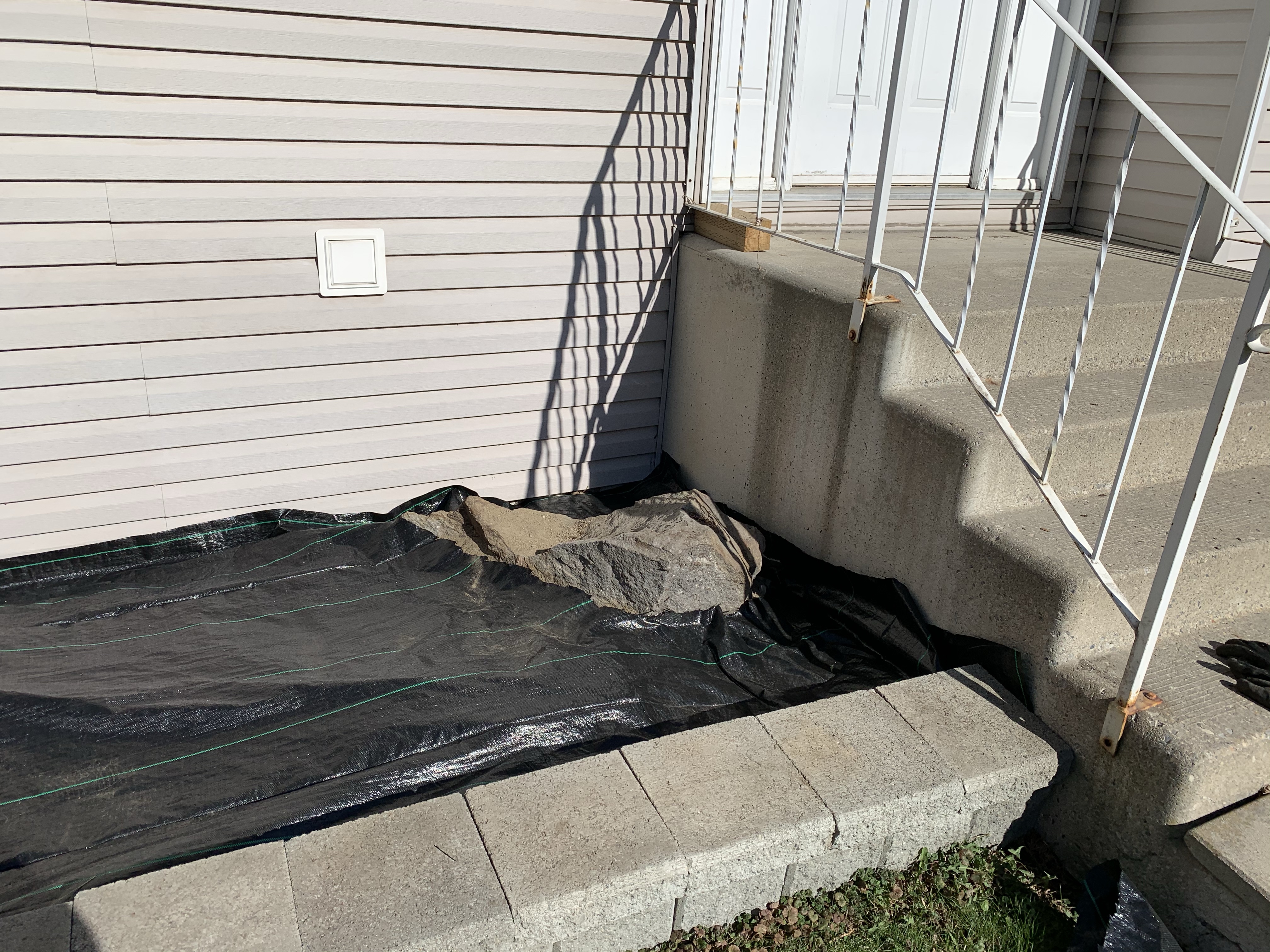 Once we got the planters levelled, we removed them and rolled out the landscaping fabric. Similar to how we did the backyard gardens, we overlapped the landscaping fabric with the brick trim. Pinching the fabric between the top brick and the 2nd brick down, ensures that the fabric doesn’t move around and also doesn’t allow the grass or weeds to wiggle up between the wall and the fabric.