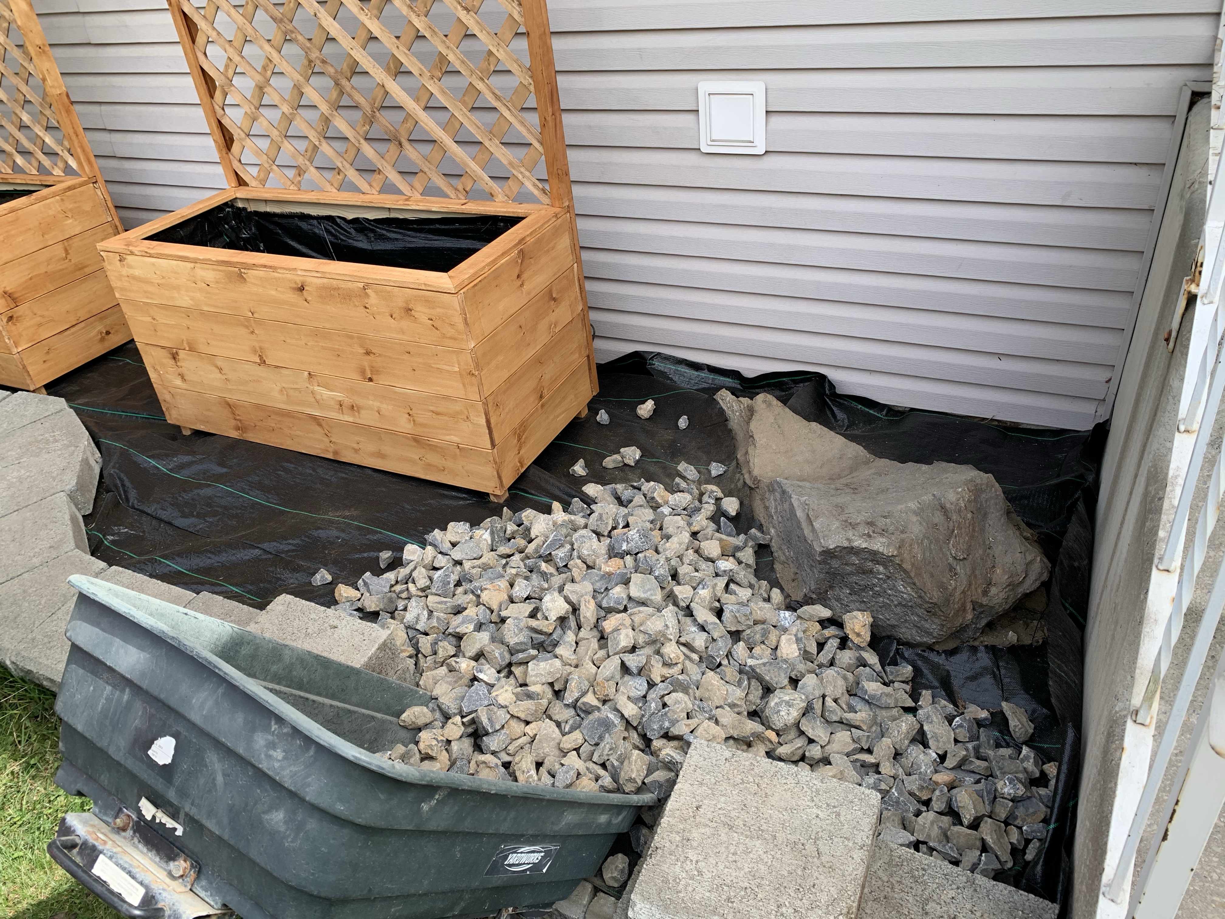 Then came the part we are VERY familiar with…time to haul rocks! We still had the awful pile of rocks that was mostly gravel, so we had a lot of sifting and trying to find the larger rocks. We eventually gave up and ordered a new batch of rocks. We will eventually have to deal with the rocks, but for now we have larger rocks again!