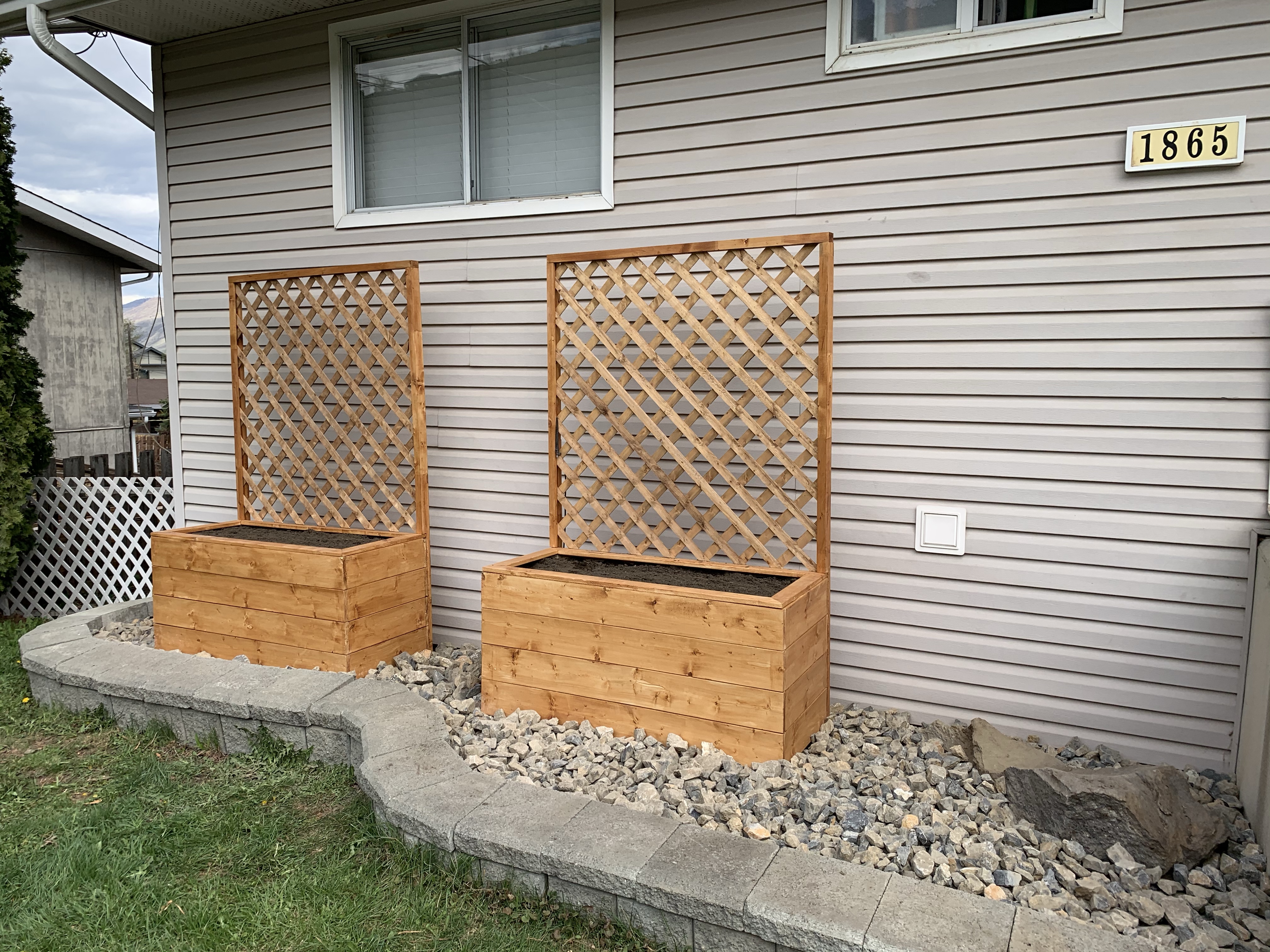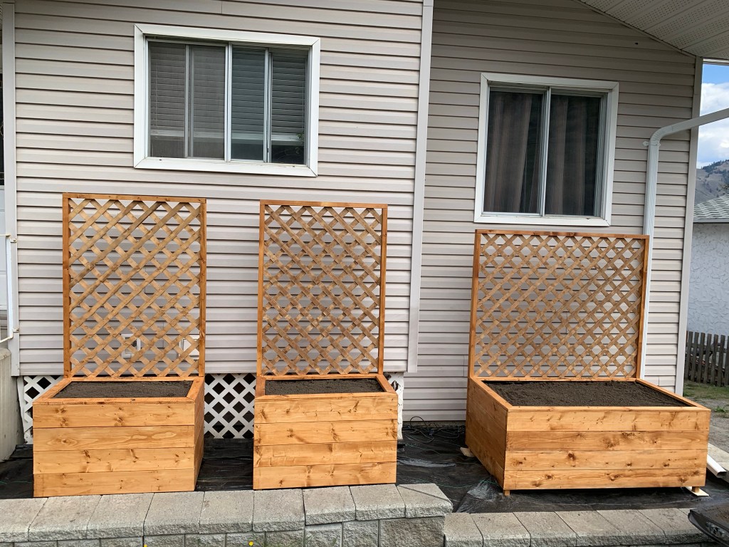 Now that we had all the beds built, it was time to get them setup in the front garden. Before we put the landscaping fabric down, we put all the planters in place to ensure we had a nice level area for them. A few needed some bricks and adjustments to keep the planter level.