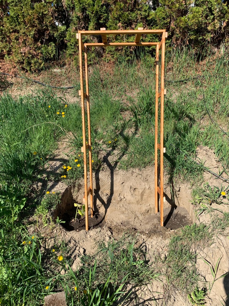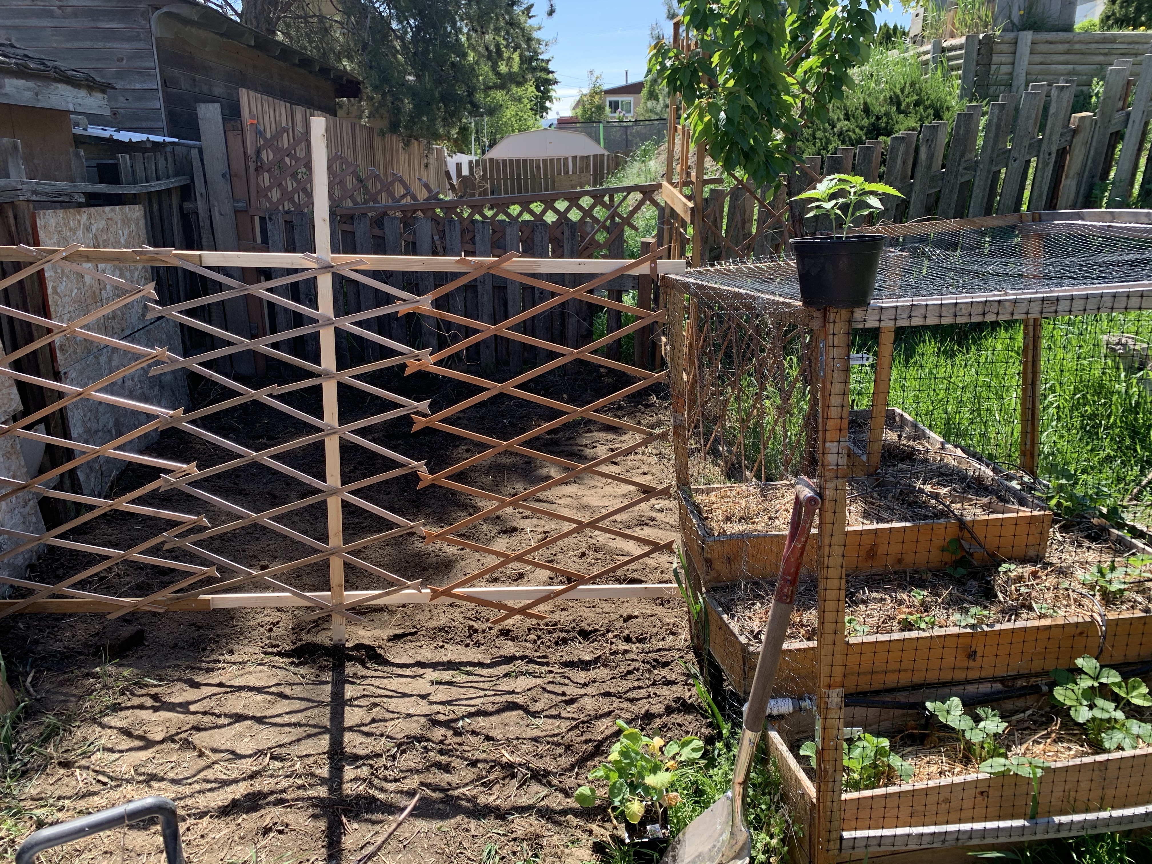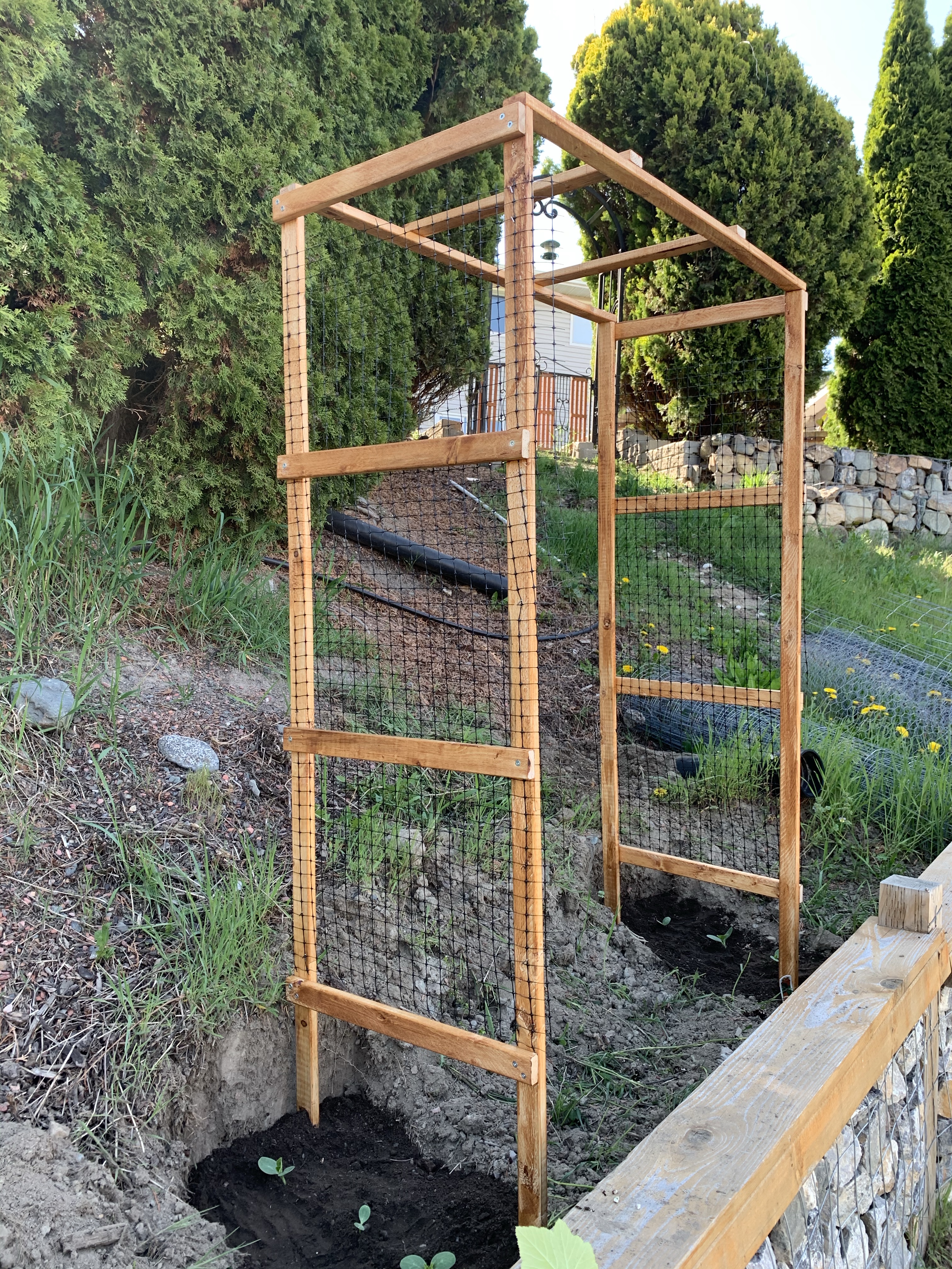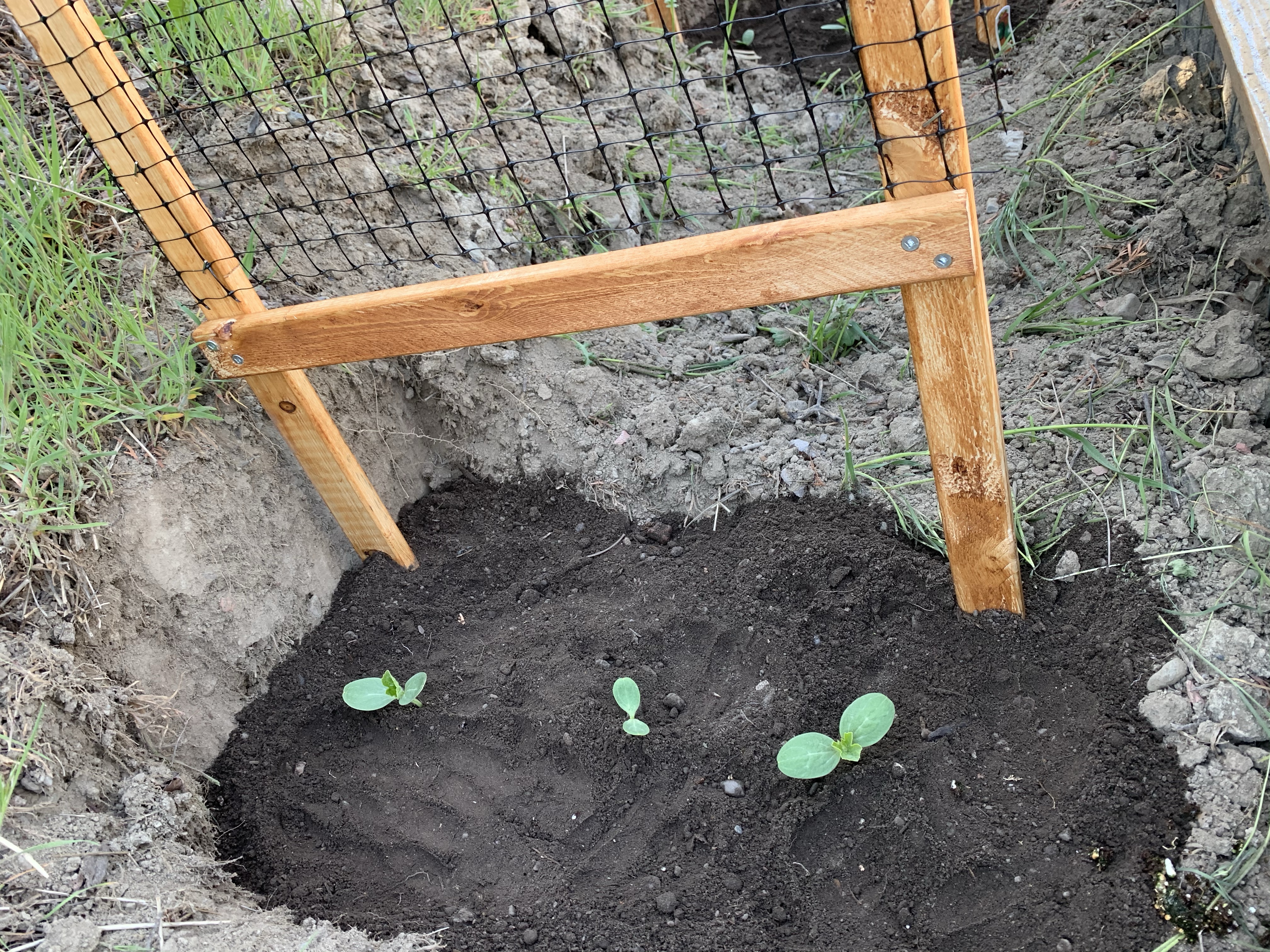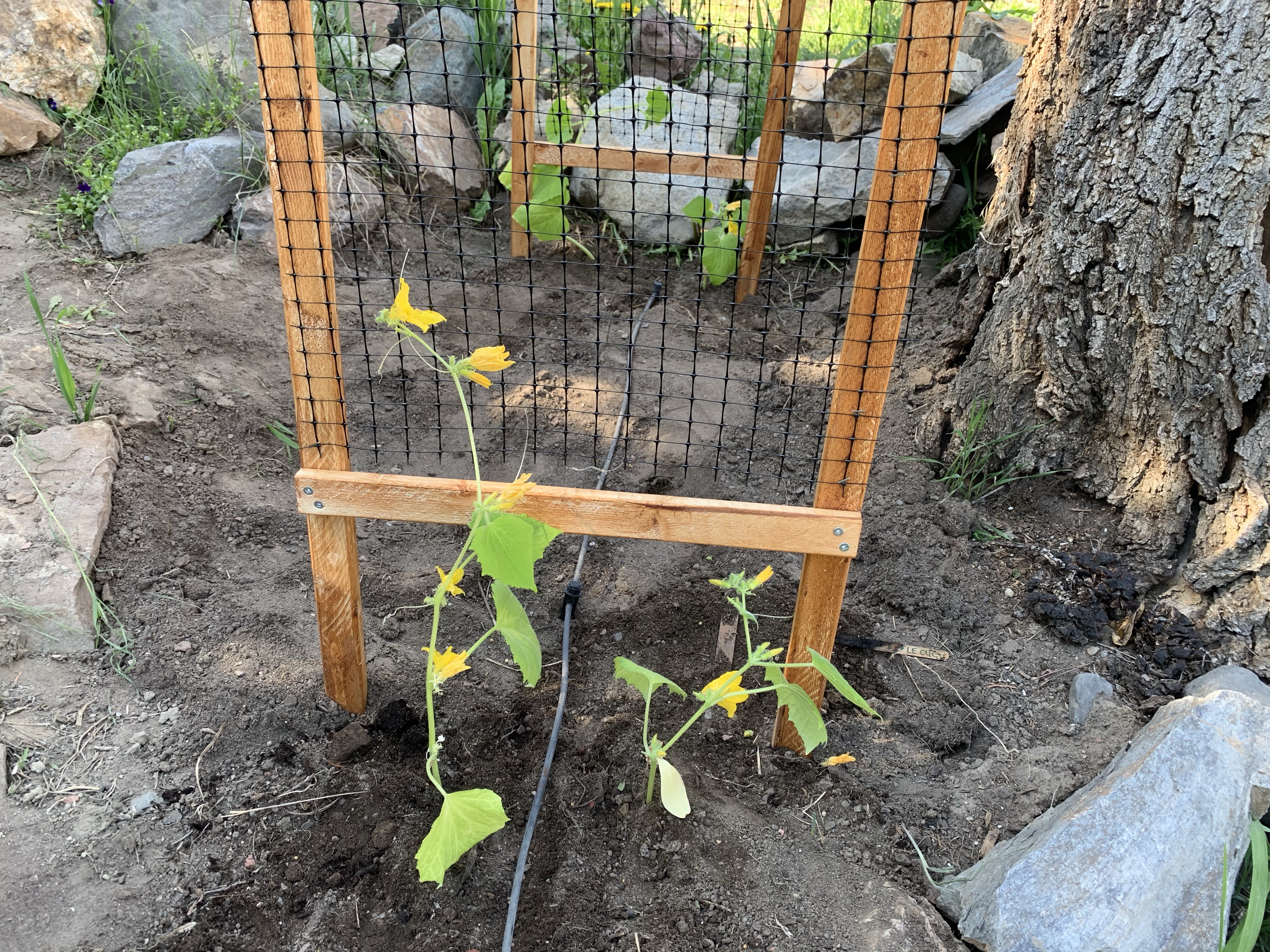 I also started some butternut squash plants and needed to find a space for those. I decided to dig out a flat space by the tomato towers and decided to also grow those vertically. I put together another trellis/arch and got them nestled into their new home on the hill. I thought I had a few plants but it turned out I only had one, so we put a few seeds in in the other side so that we hopefully have a plant on both sides.