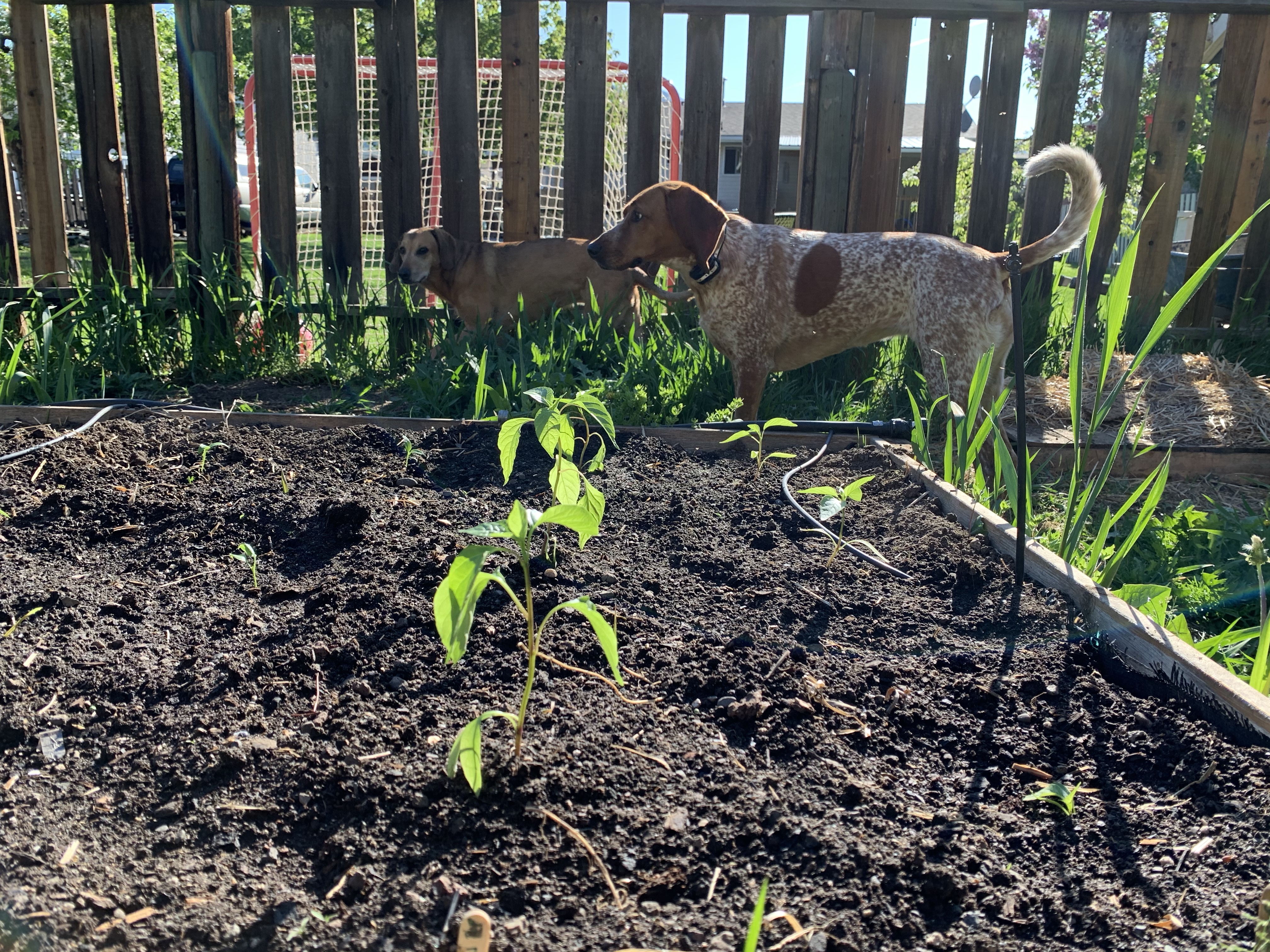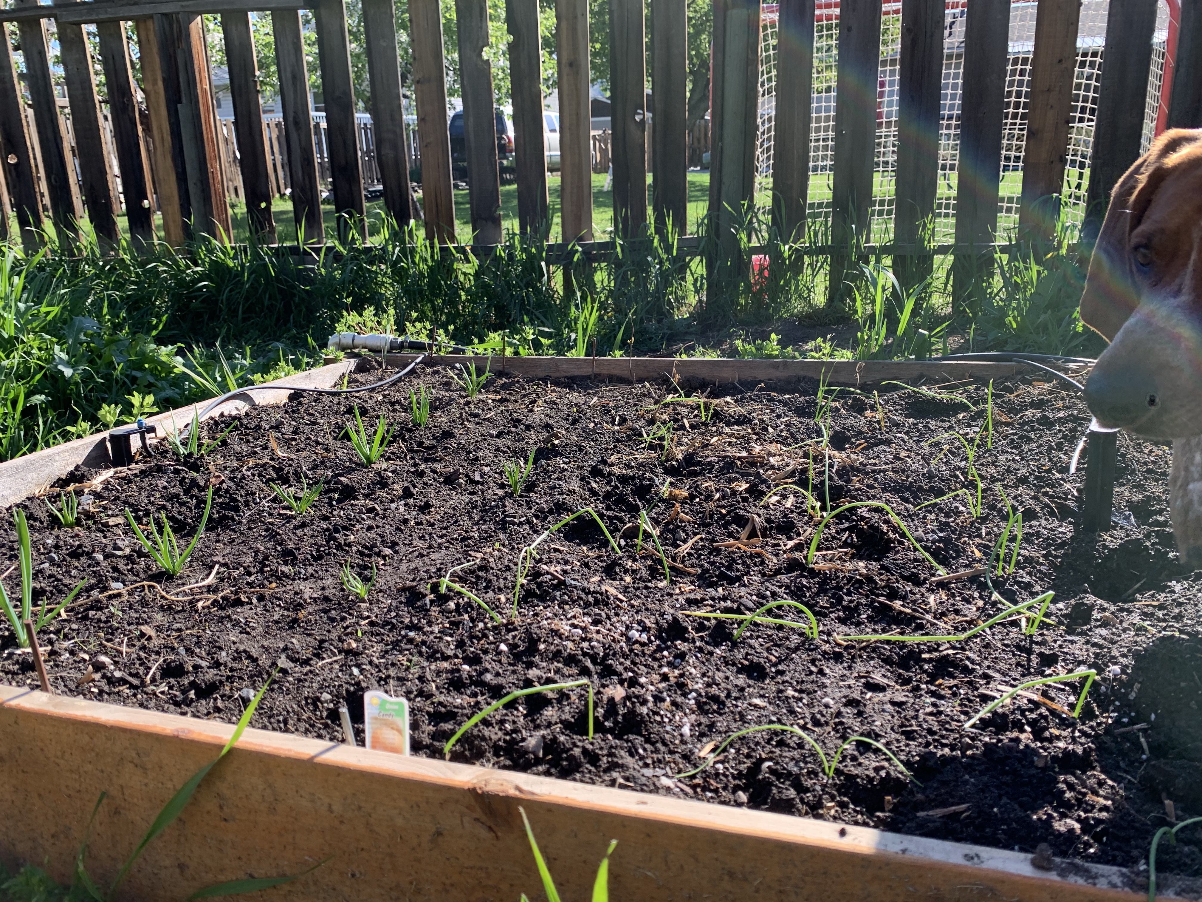 In our raised beds we have carrots, beets, onions and peppers. The raised bed on the left will only be growing carrots and beets. We have staggered the rows by a few weeks so we should have veggies coming off staggered as well. To ensure our carrot bandit doesn’t decimate the crop and enjoy the harvest by herself, we have temporarily turned our temporary greenhouse cover that went over the bed in early spring, into a fence around the bed. My plan is to build something a little easier to open and close, but for now this will keep her exploratory snooter out of the bed. Also, she has a habit of running through the beds when she doesn’t think there is food in them, ruining our first planting.