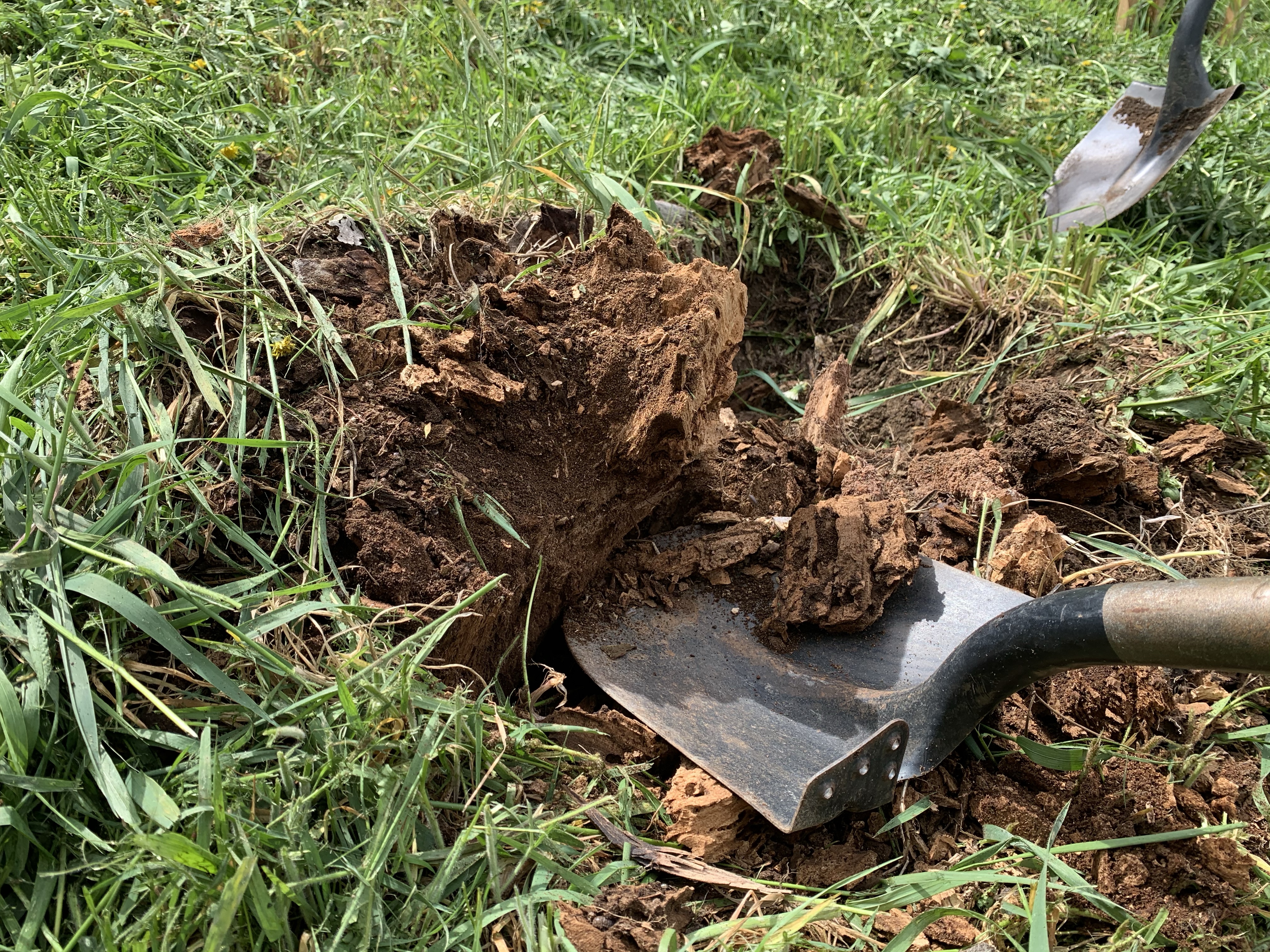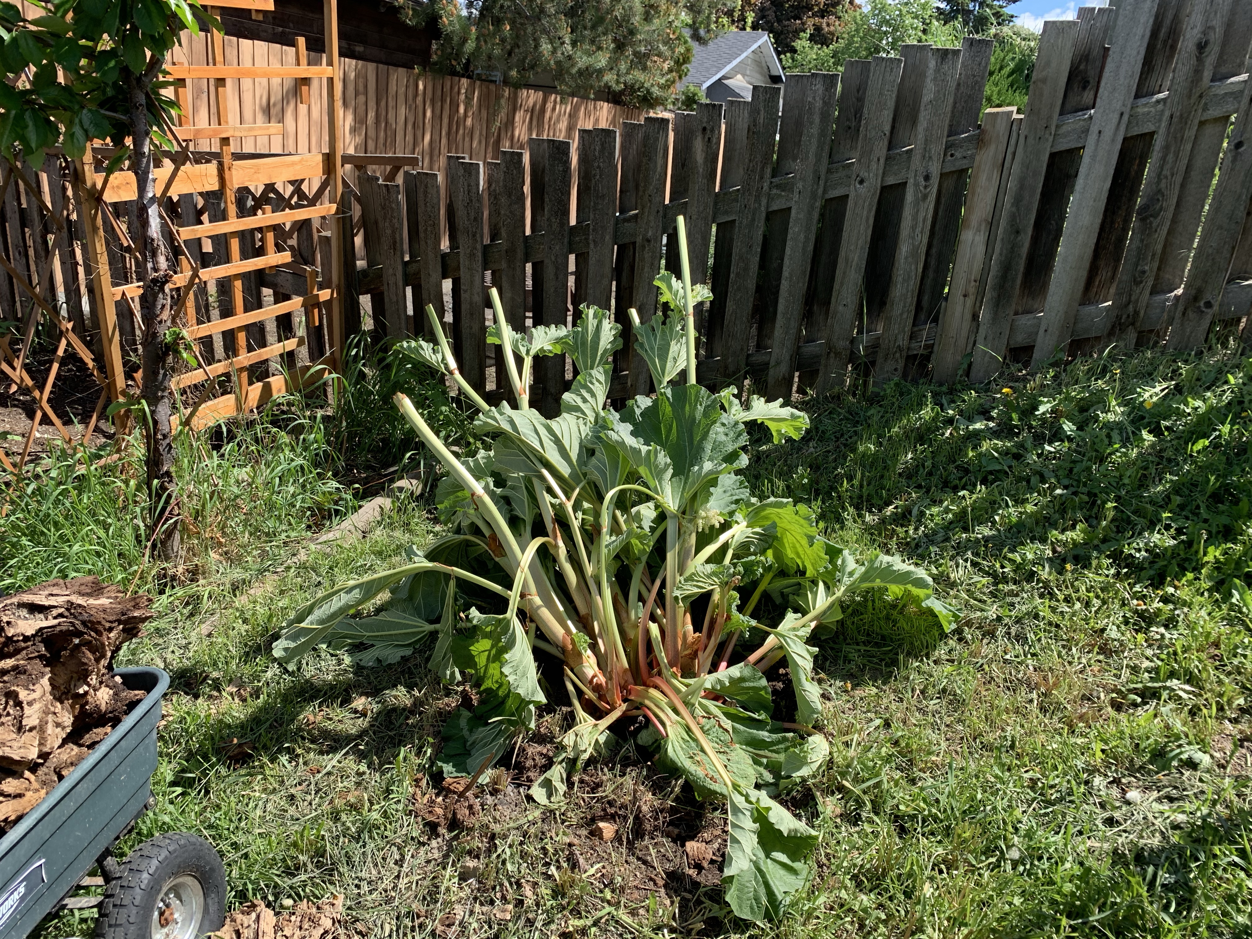 Yesterday, our neighbour passed along a rhubarb plant. Not something we are ready for, but hard to pass up, so we found a spot by the tomatoes and strawberries. We had an old stump that we needed to remove anyways, so we dug it out and put the rhubarb in. Luckily the stump was really old and fell apart as we dug it out. I think the soil will be great for the rhubarb. Our neighbour also gave us some manure fertilizer to put in the hole for the roots, so that will help.