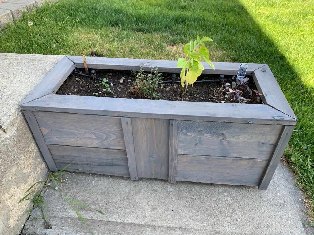 All of our herbs went out into the herb planter. I removed the dividers this year and will let them all mix up with each other if they like. My rosemary is doing so well inside that I am going to leave it inside. Once we have a permanent location for it, I will likely plant another rosemary plant outside. The herb planter has purple basil, Italian basil, oregano and thyme. The little planter that I made from scraps is going great and doesn’t show any sign of weathering after being left out for the winter.