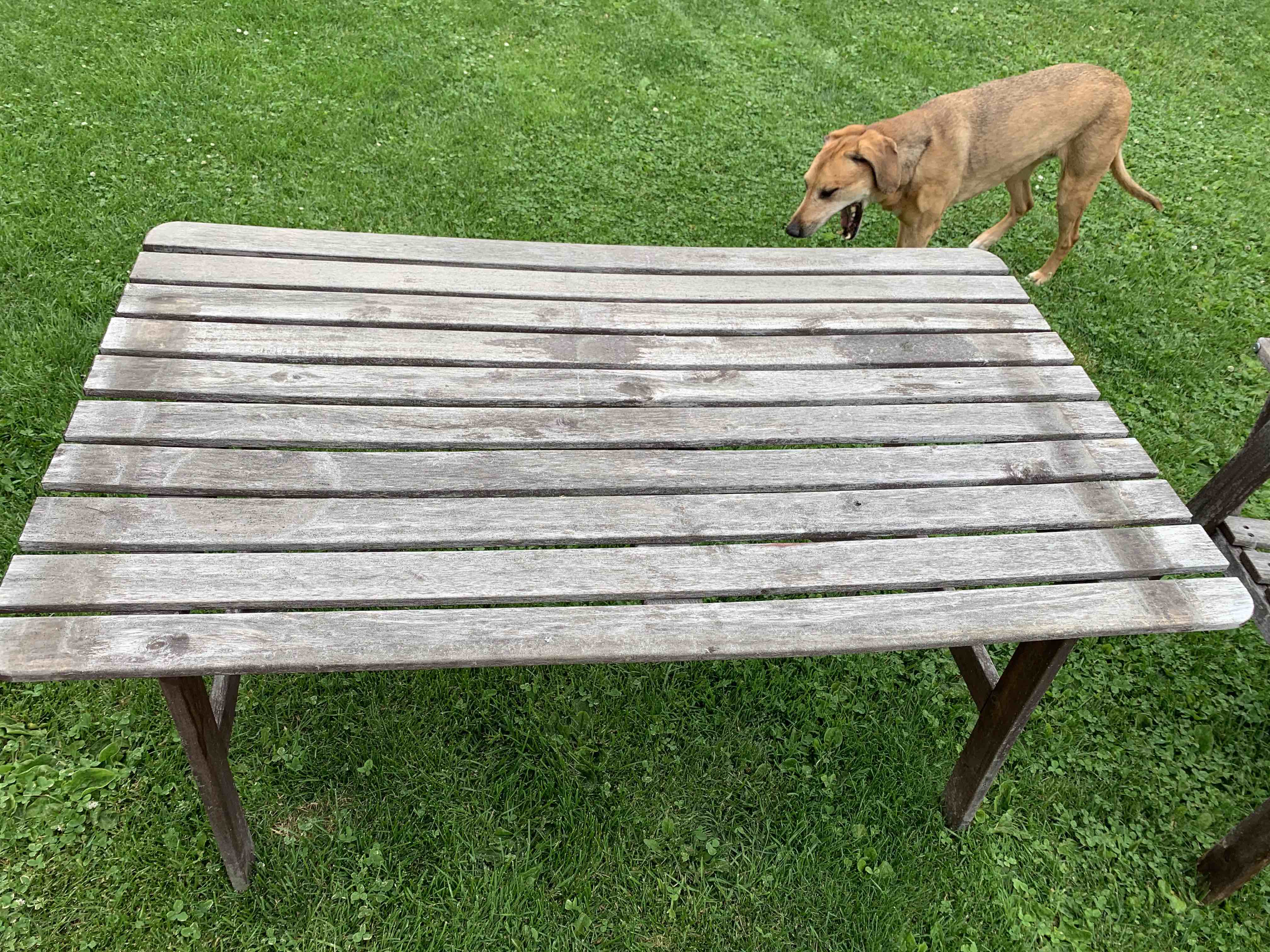 On the third day, some very exciting things happened, but I will get to that in an upcoming blog. One of the exciting things though, was that I managed to get the stain on the table and bench, and it turned out beautiful! I love the colour, and the grain of the wood just popped. Some of the “grain” may still be grime that was deeply embedded, but it made for a really nice effect. They are going to look great down in the bottom of the yard, and I am looking forward to using them for well-deserved breaks when working down there. I just need to find a spot that is shady most of the day.