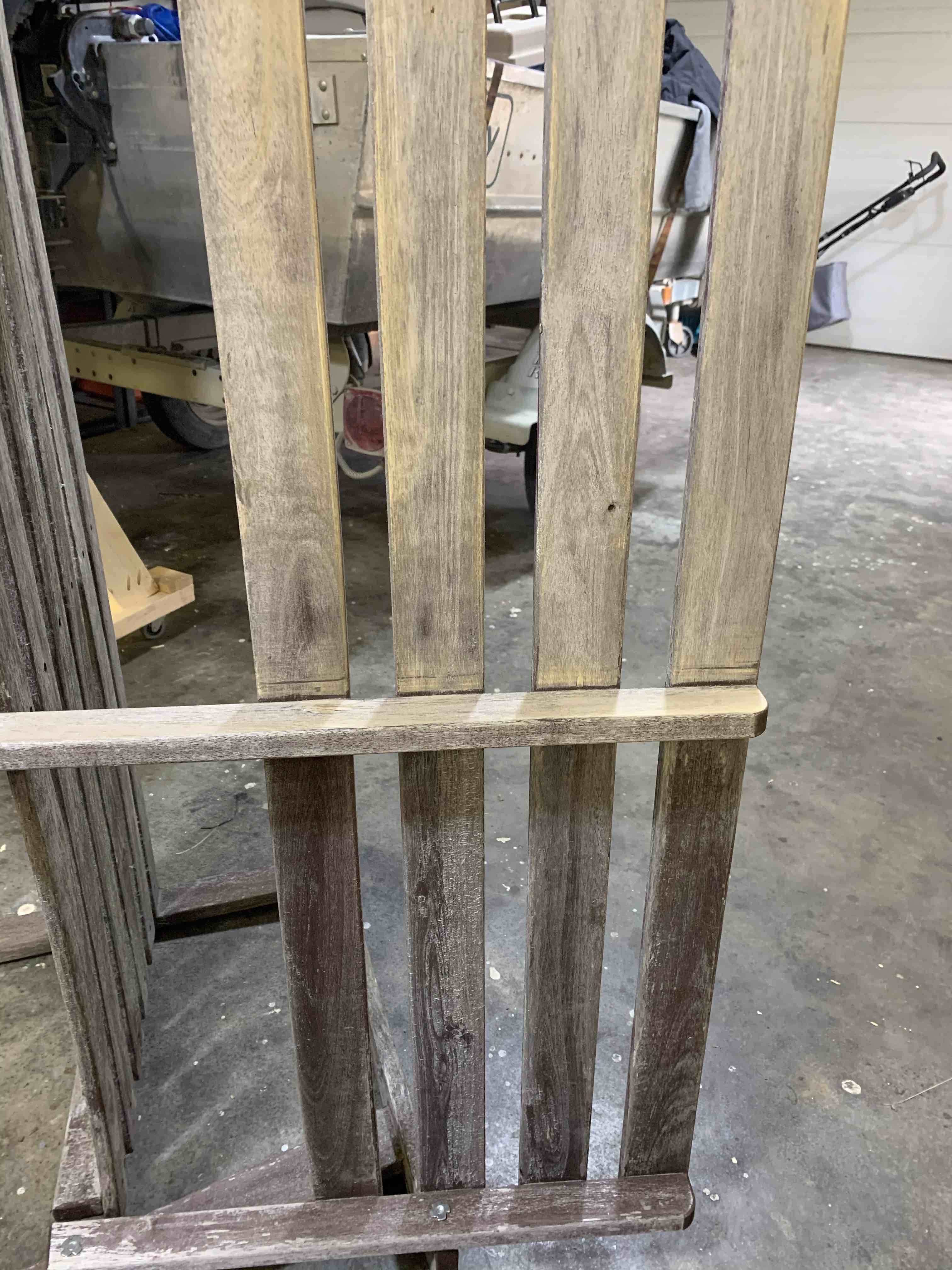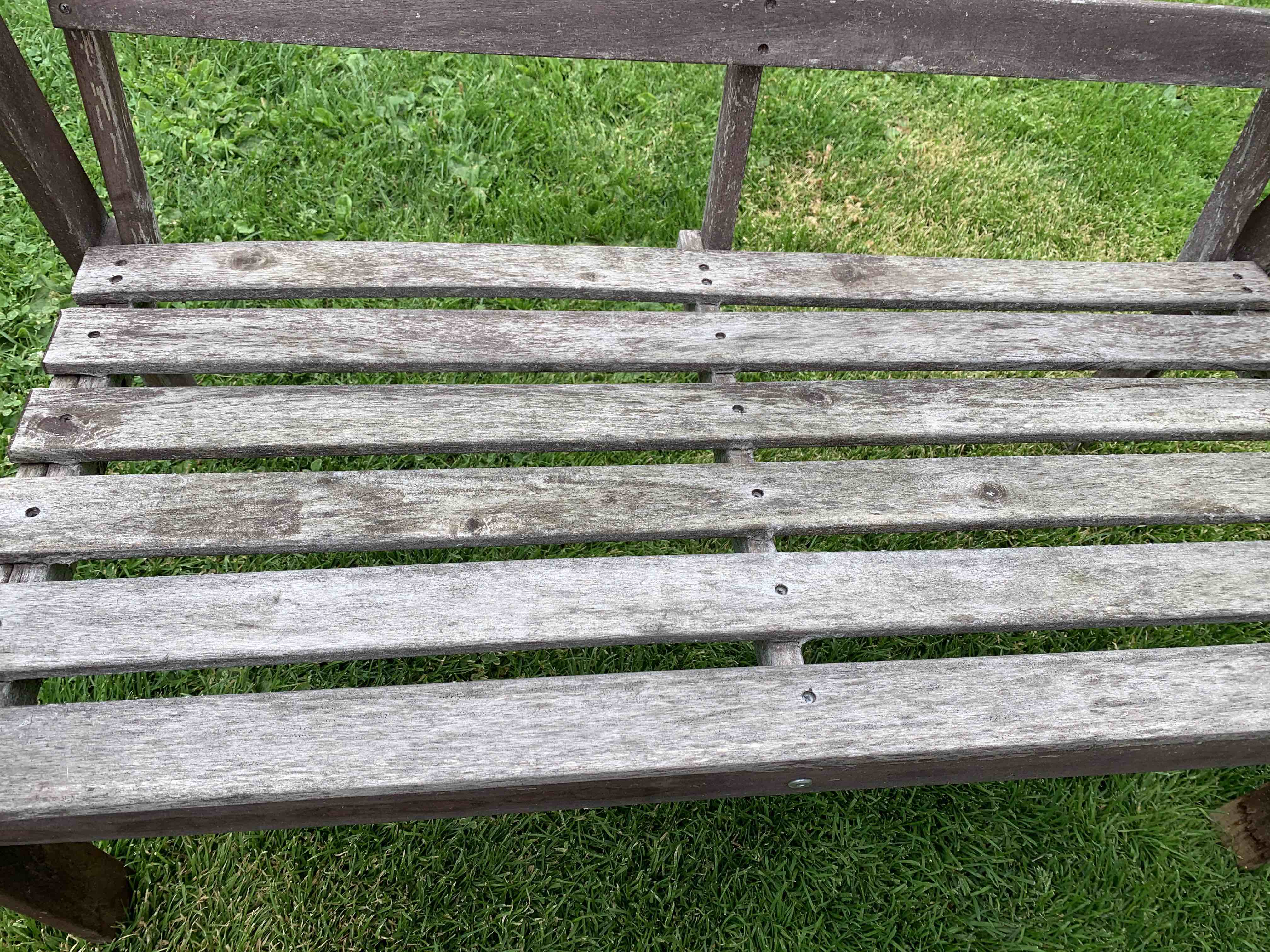 Although it looked a little worse for wear, the set is still really solid and sturdy. It is exactly what we need down at the bottom of the yard! It will give us somewhere to take a break, and also a table to put tools, snacks or beverages while we are hanging out/working hard. Although the set was weathered and the old paint/stain was chipped and flaking away, it was easy to see that the wood was good under the dirt and stain. It just needed a little re-finishing.