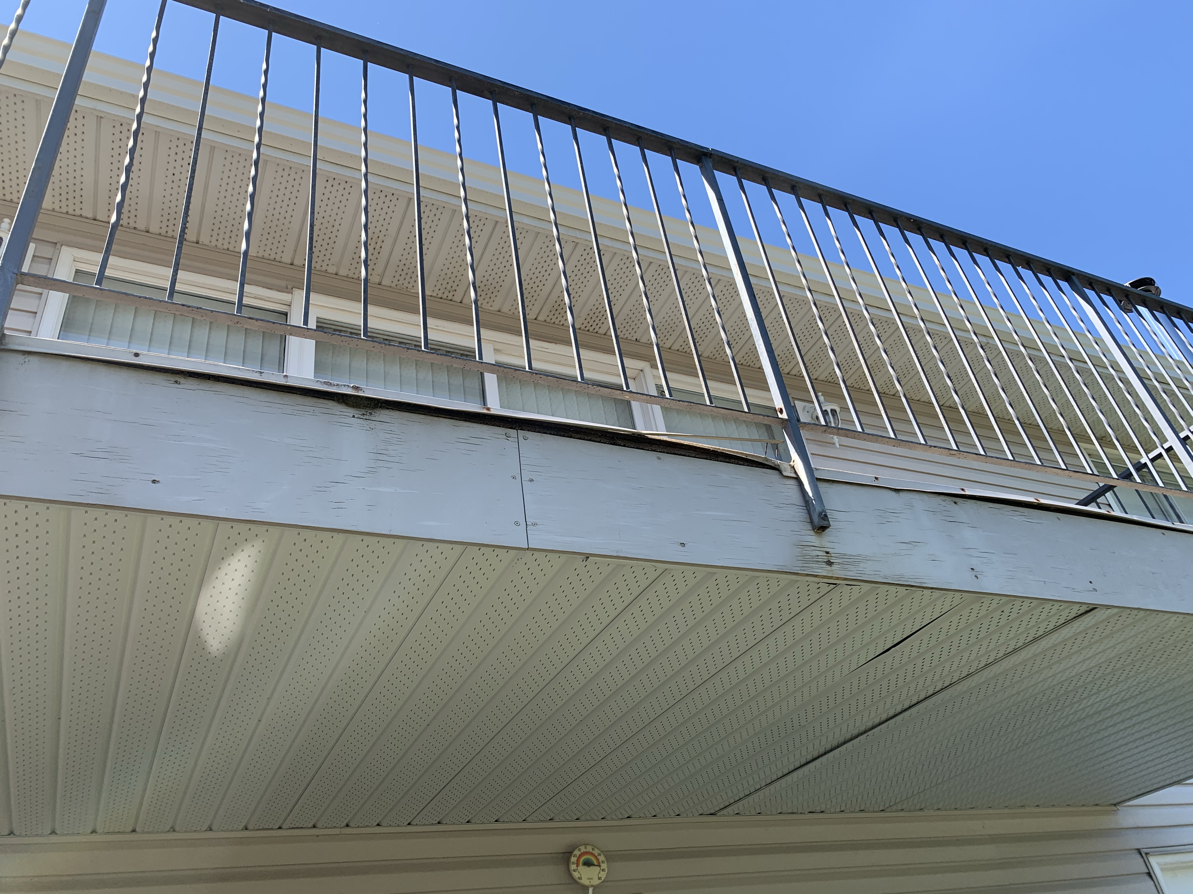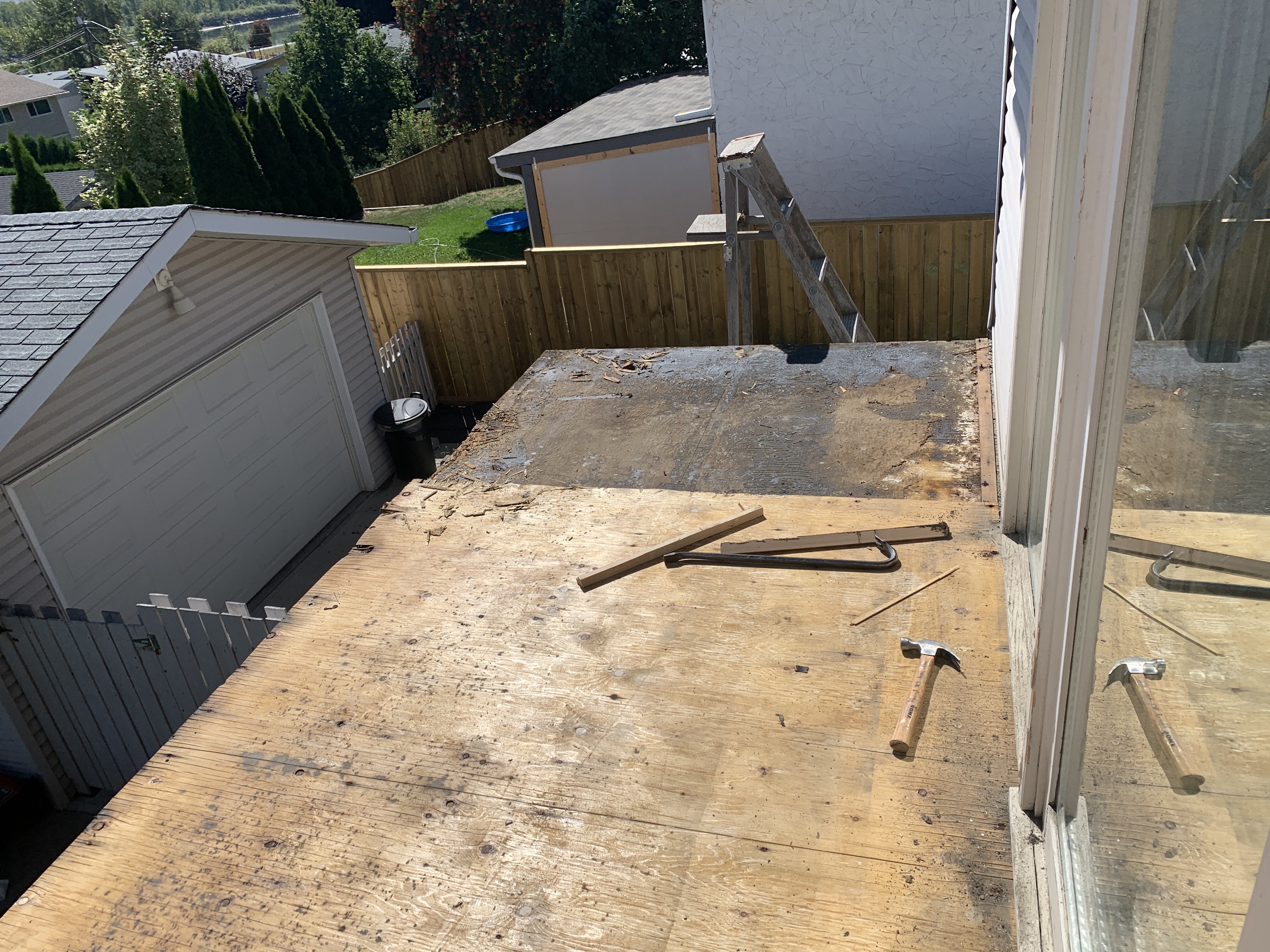 Once the railings were down I could start getting the plywood off and take it down to the beams. Our deck does not have pillars, it is built on the beams that run through our entire house and stick out 8’ for the deck. It is a unique design, but popular in the 70’s and 80’s when our house was built. I knew that I didn’t want to take the soffit out from under the deck if I didn’t have to. I setup a few ladders, grabbed a crowbar and hammer and got to it. By this point it was around 8:30 am and 30C already. We get the morning sun on our deck, which is nice when drinking your morning tea or coffee, not so nice when doing laborious work.