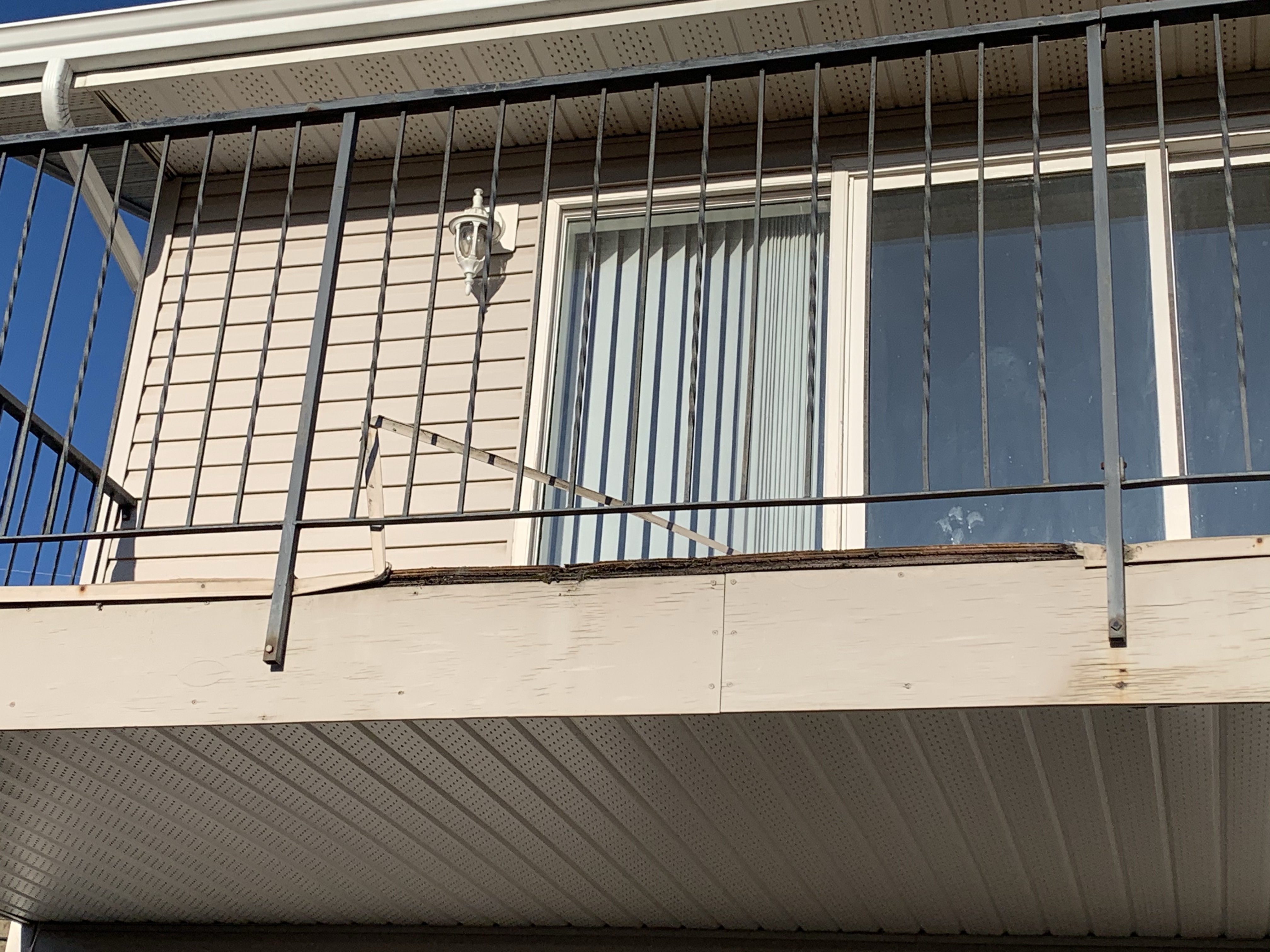 We knew the deck would need to be re-covered as it was worn looking and the old fibreglass material covering was starting to get holes, but for the most part it was in good condition. A couple years ago, we noticed it starting to deteriorate…and probably should have redone it at that point, but with all the landscaping and work in the yard, we put it off for a few years. After this last winter we knew it would have to be redone this year. There were nail or screw heads poking up, the edge was spongy, the metal around the edge was separating, there was moss growing and around the railing posts it was clearly rotting. There were also a few small holes forming in the fibreglass material.