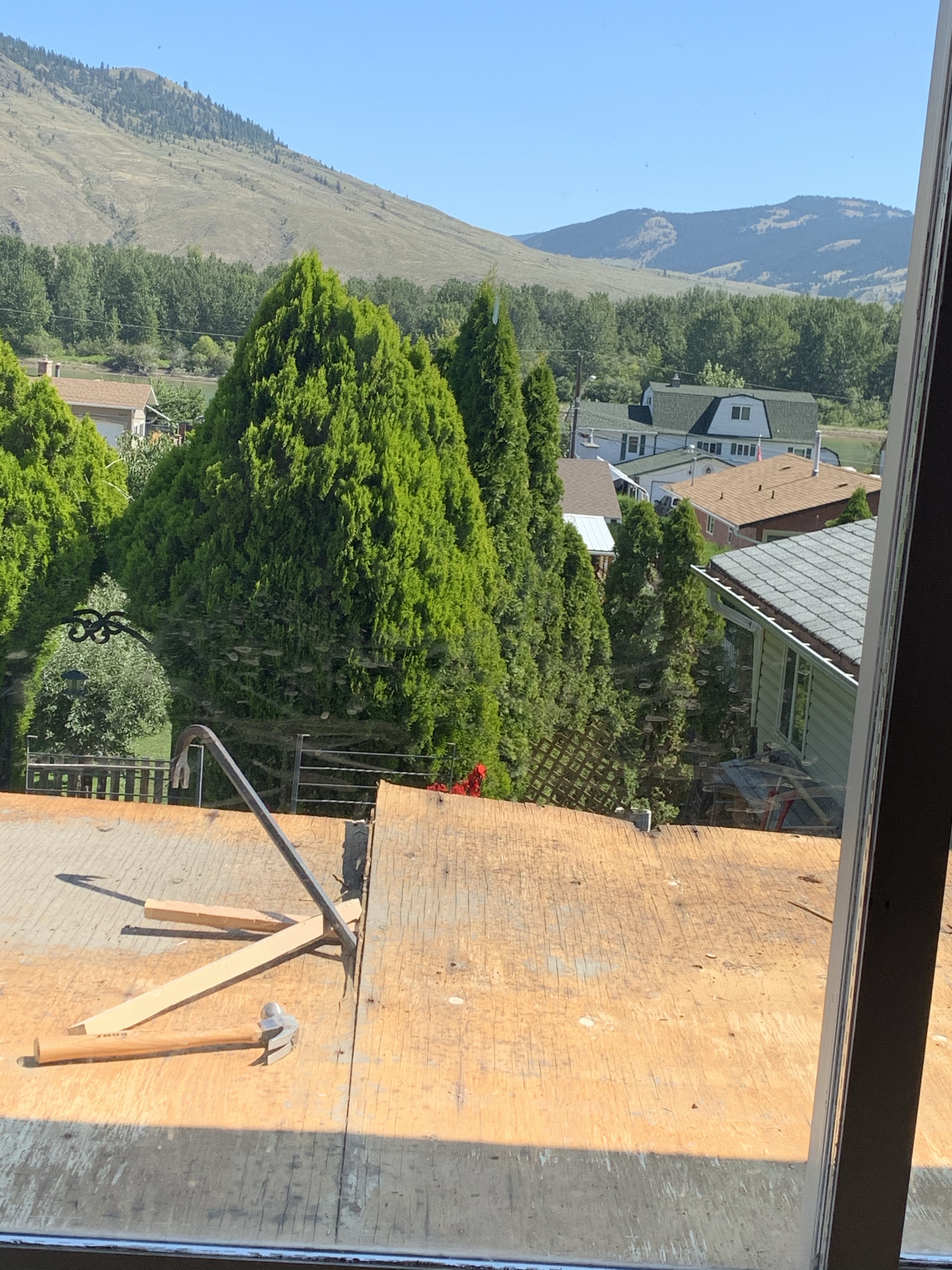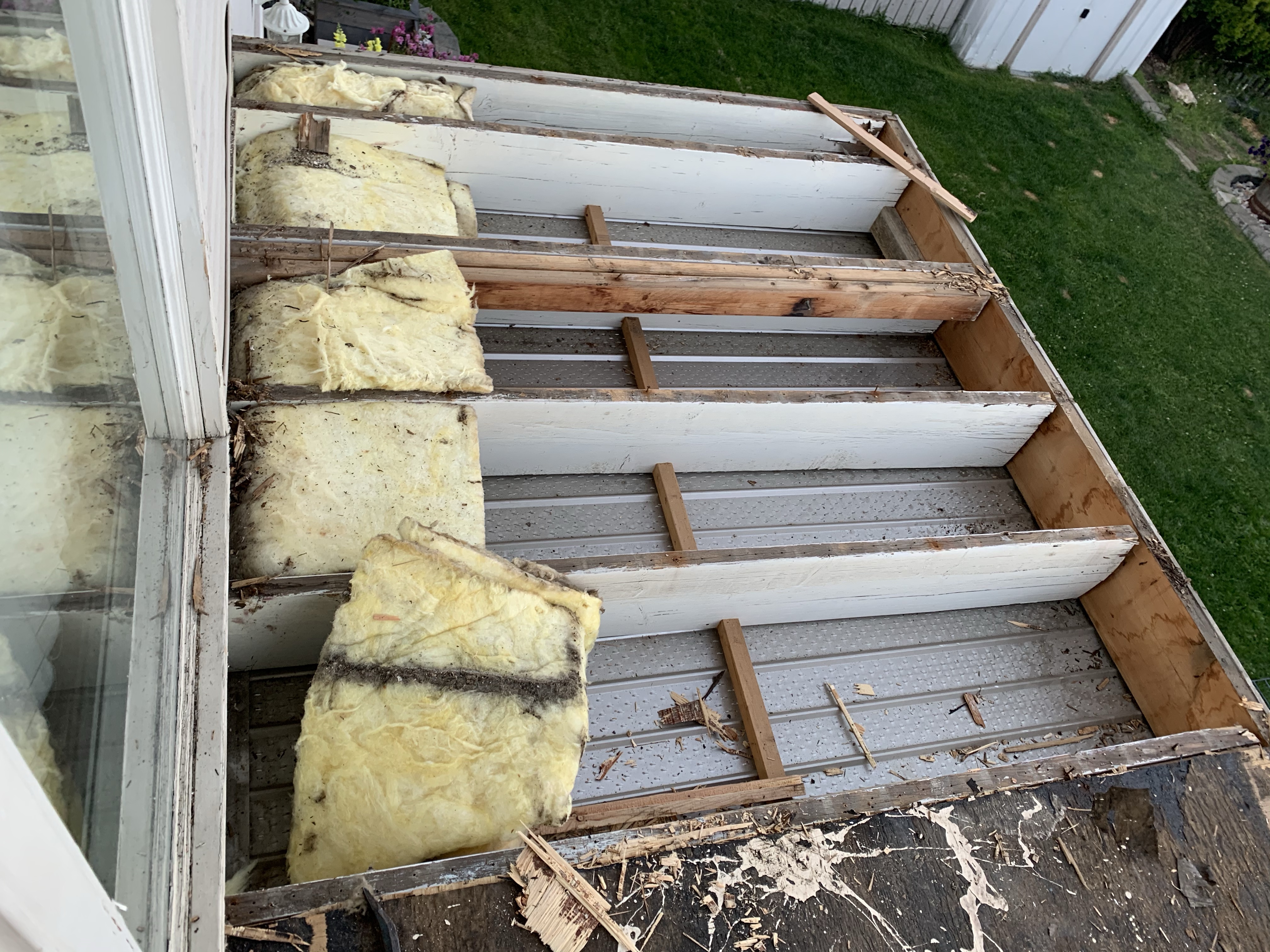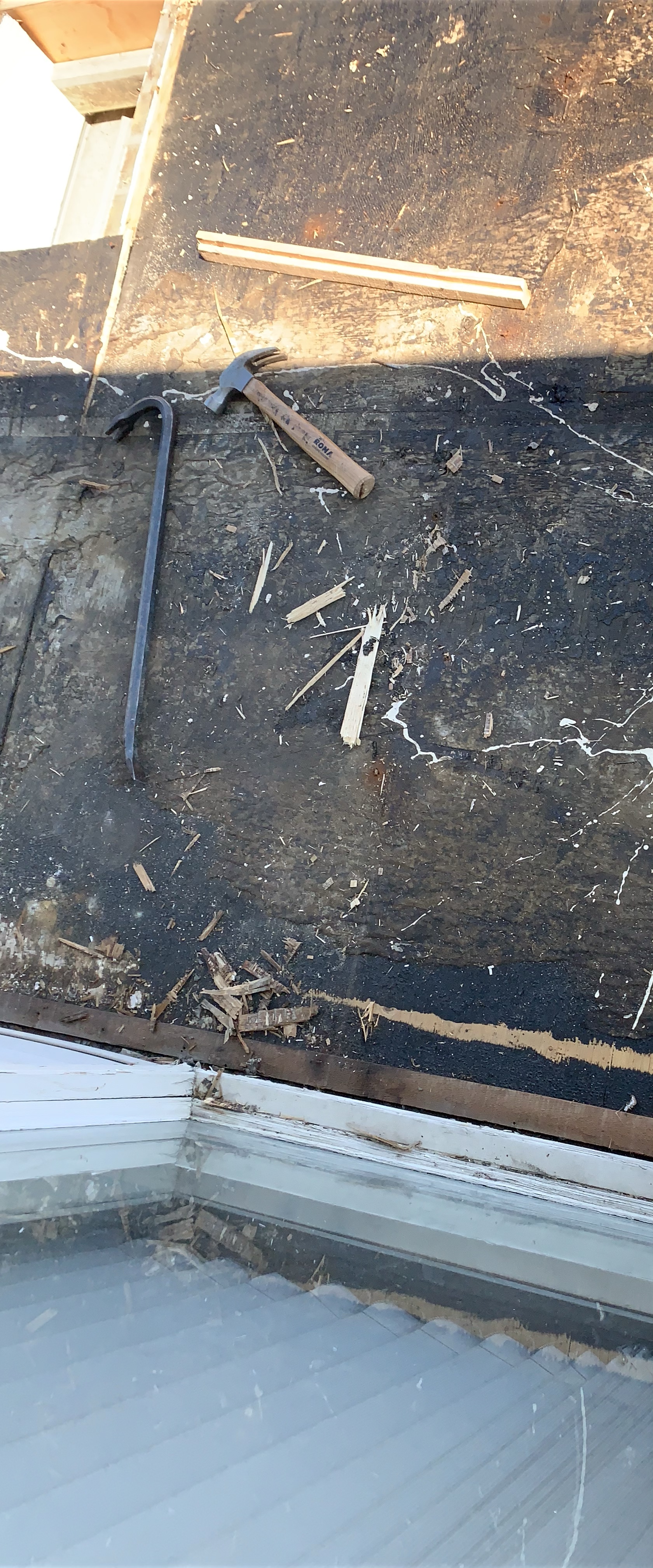 Although K and I are figuring things out with a lot of our landscaping, we are doing our absolute best to do the right things so that we hopefully don’t leave a disaster to be dealt with by whoever buys our house one day a very long time from now. This discovery made me so angry. The even worse part, is that there was tar on the bottom boards which made tearing it down to studs that much more complicated. They had also used tongue and groove plywood (a good thing), which also made the process more complicated. I got all of the top layer off and then worked on the bottom layer. I’m going to stop whinging here. I did it. It took 4 hours and I managed to get most of it up. By that point I was overheating, so I decided to finish off the last few boards that evening when it would hopefully be cooler and when K was home and could help. We managed to get all but the last two up and they were the ones right by the door, so I figured I’d leave it for dad and I to use to walk on the next day when we were laying down the new plywood. We would pull it up once we had a few of the new plywood sheets in place.