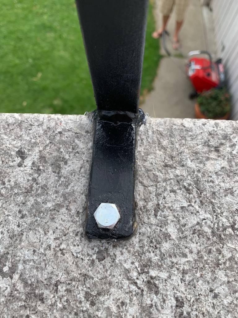 We then put the first railing in place and marked where the legs would be going. Once marked, we swung the railing sideways to give my dad room to get the saw into place. We used a hacksaw and worked in tandem. My dad on the deck pulled up and from a ladder below, I pulled down. Made quick work. We then had to use a chisel to take out half of the 1”x2” board that they had used to square the edge for the drip plate. Then we globed a bunch of the sealant into the space we had just cut and flattened the Duradek into place for the railing to rest against. We then moved the railing back into place and bolted it to the wall. Dad and I then pre-drilled holes for the lag bolts. Once the holes were pre-drilled, we squeezed a bunch of sealant into the holes to stop water from getting in under the bolt, and drilled the bolt into place. There was a bit of cleanup needed as the sealant squeezed up and around the bolt.
