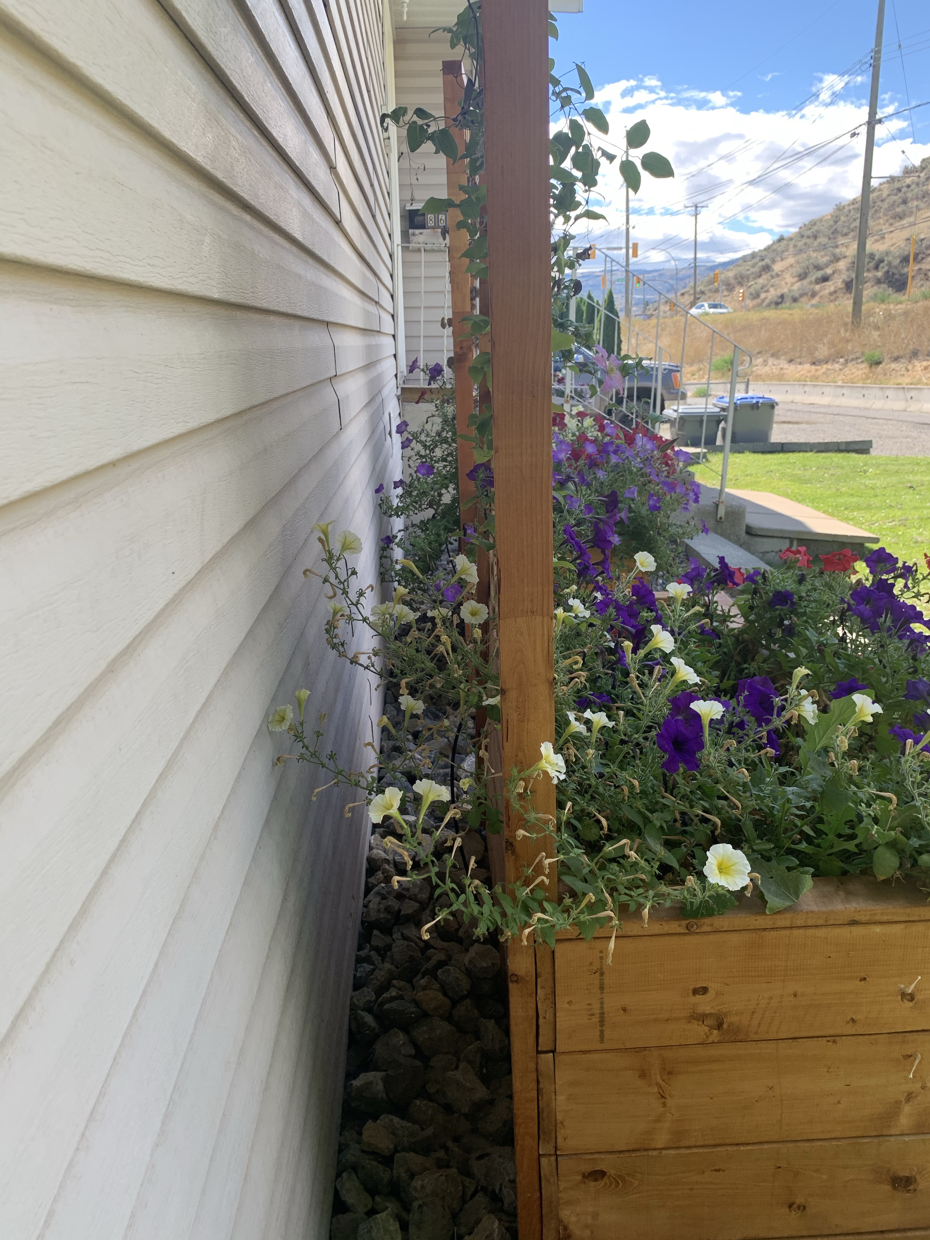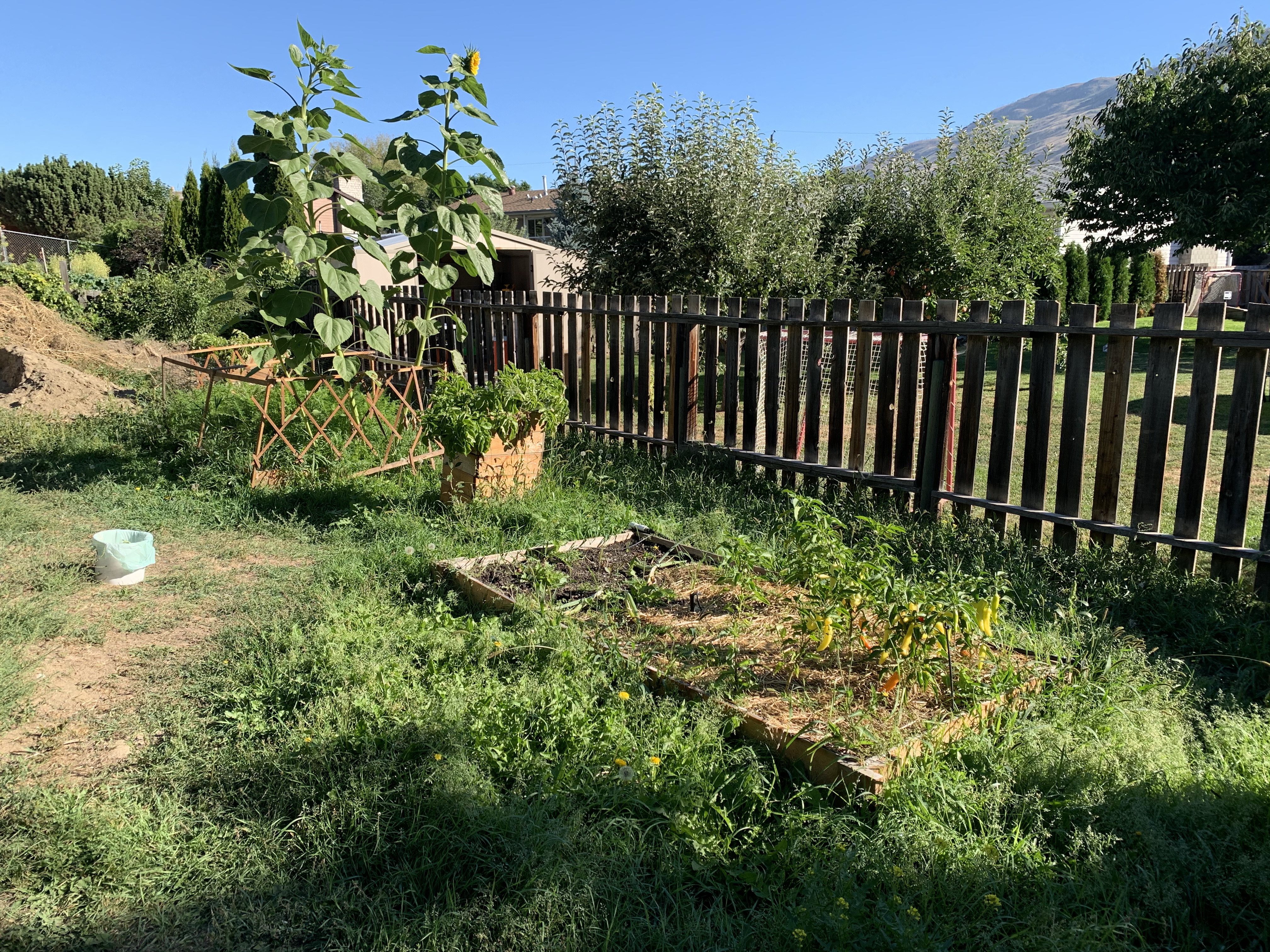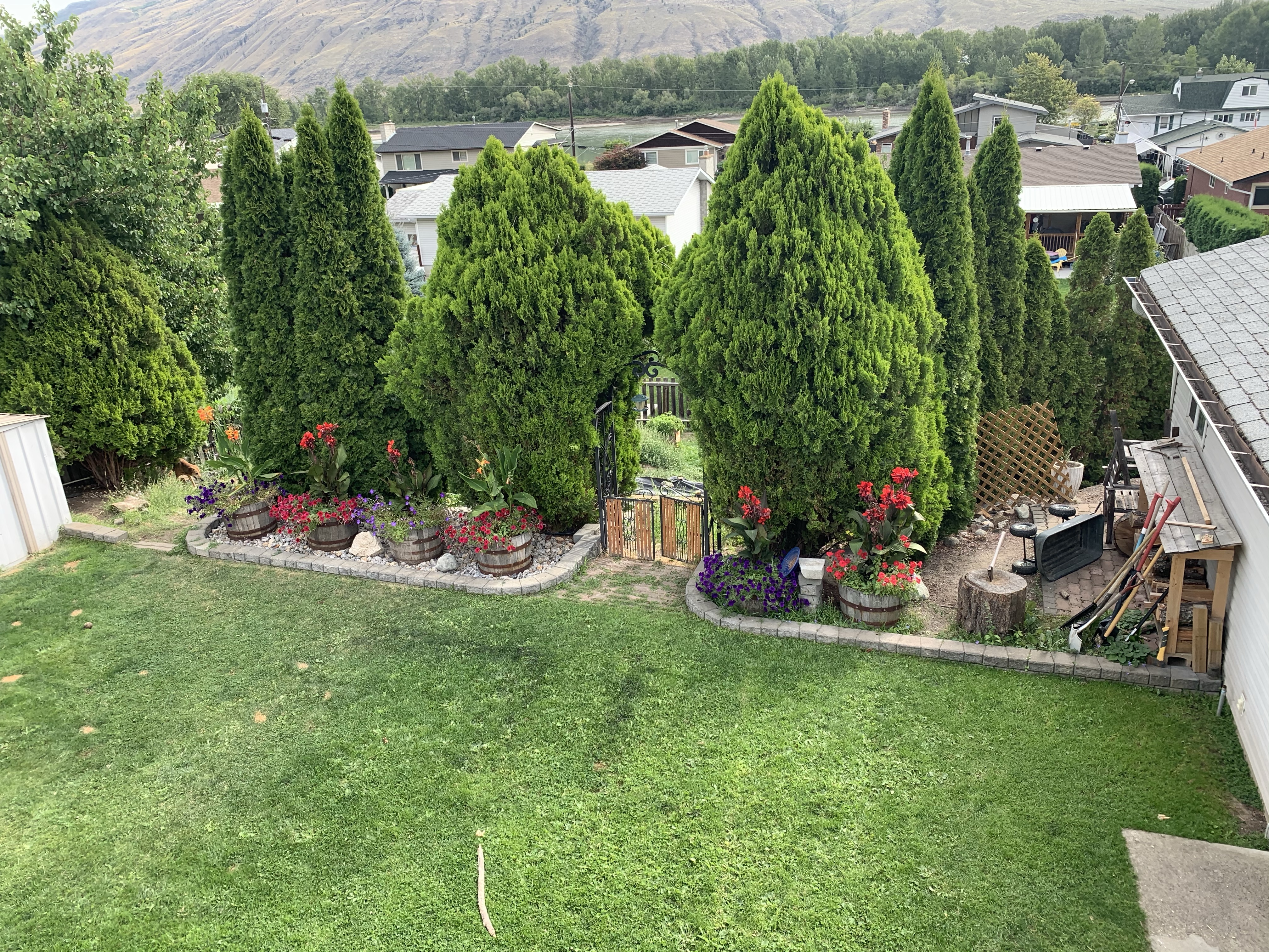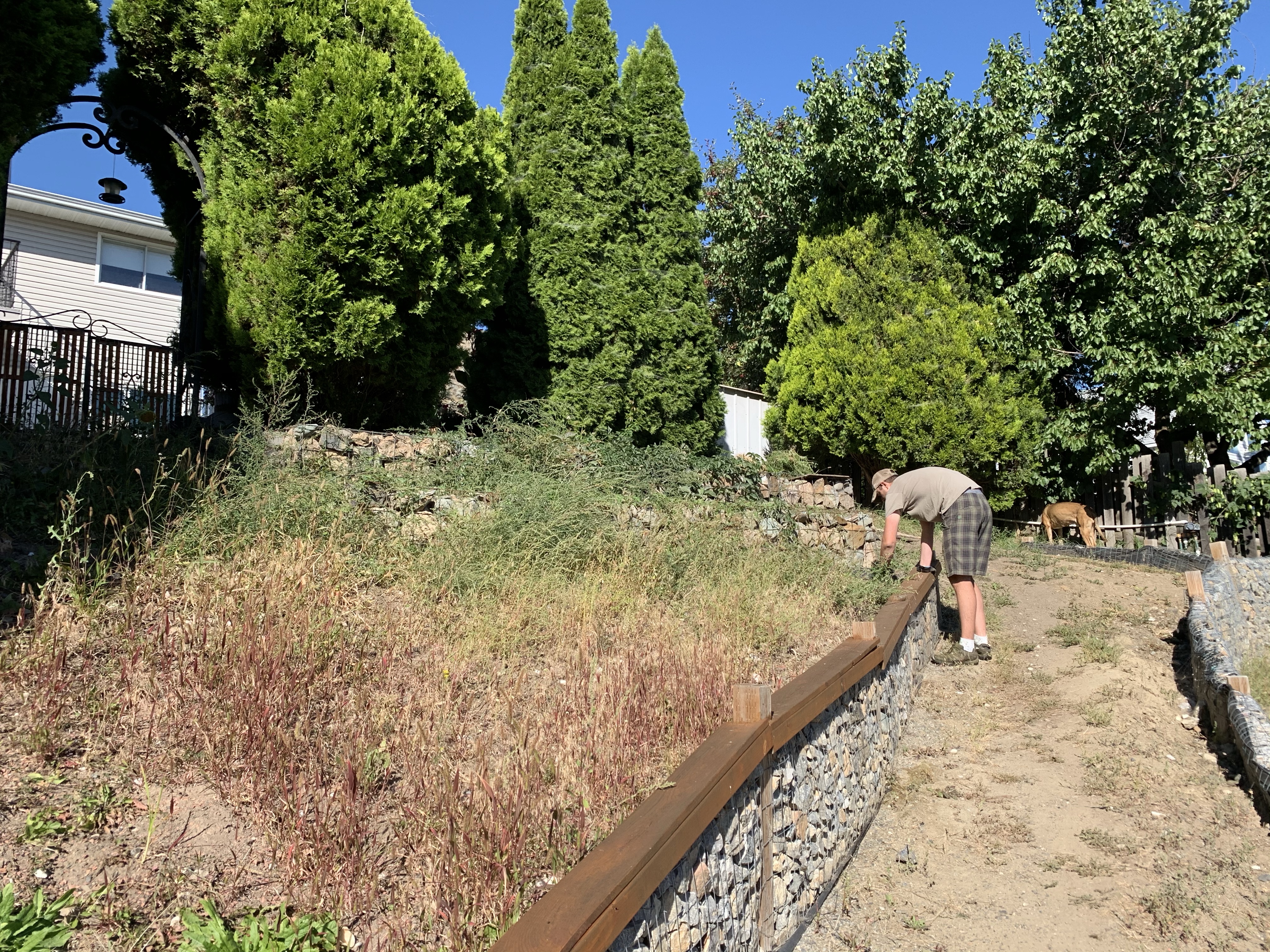 Last but certainly not least, the weeds and grass have really been loving this weather. We covered all the levels with lumber tarp to keep the weeds out of our new beds, but everywhere else is thick. The “grass” at the bottom of the yard is almost so nice that we could mow it. It’s not the thick, brittle, wild grass anymore. It is now a lush, soft carpet. It looks beautiful when trimmed, but crazy wilderness when it has been a few weeks. K gets down there with the weed-whacker and smacks it down to a normal height. Our yard goes from wild to looking well kept very quickly. The few areas that weeds grow need to be plucked regularly, otherwise they quickly take over an area. We also have some natural vines that take over our top walls and try to climb our beautiful cedar trees. We have to keep those under control otherwise they weave between the wall and become very difficult to remove.