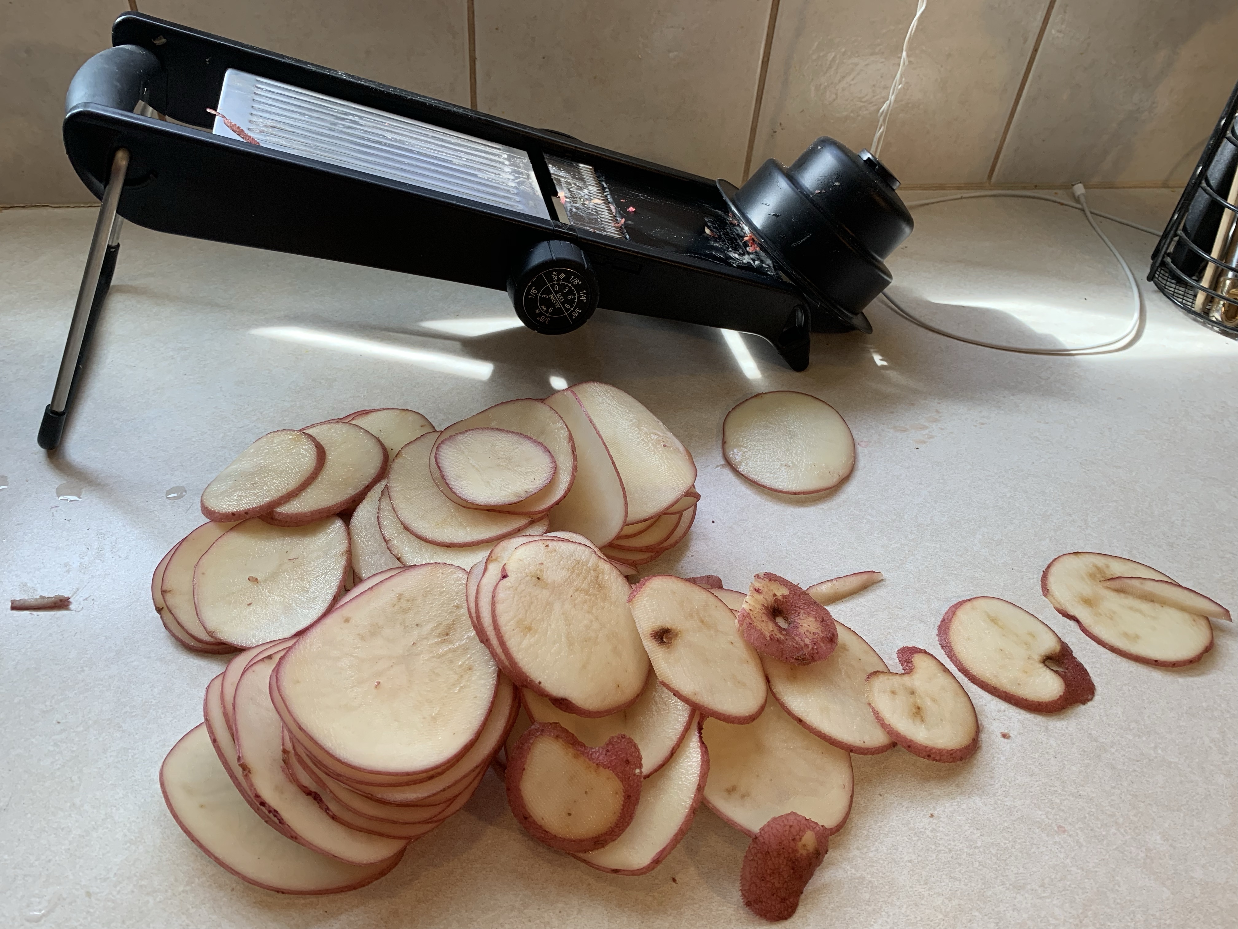 ~ 1-2 large potatoes, sliced 1/8” thick
