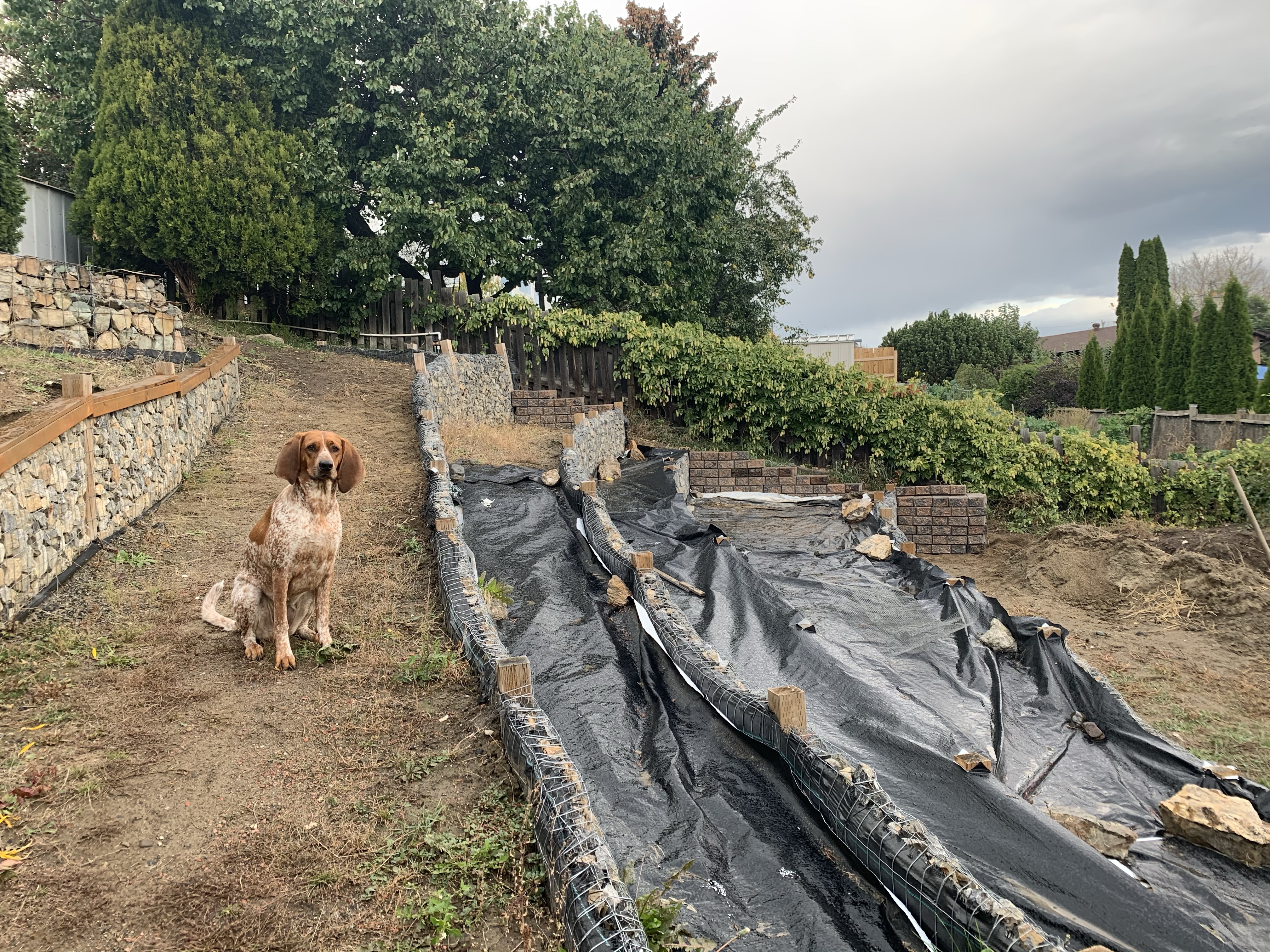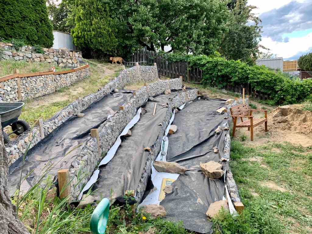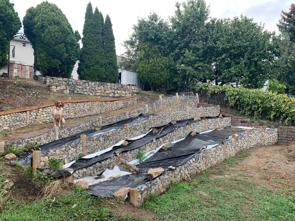 We will also be building a wall from the bottom wall to frame in the path that runs along the fence until it blends into the yard. We can’t finish that wall until we have removed the temporary raised beds and levelled the bottom of the yard. We are going to wait to do that until after we have built our new fence along the back in the spring. So many domino steps now. We have to start completing projects in order for it all to come together.