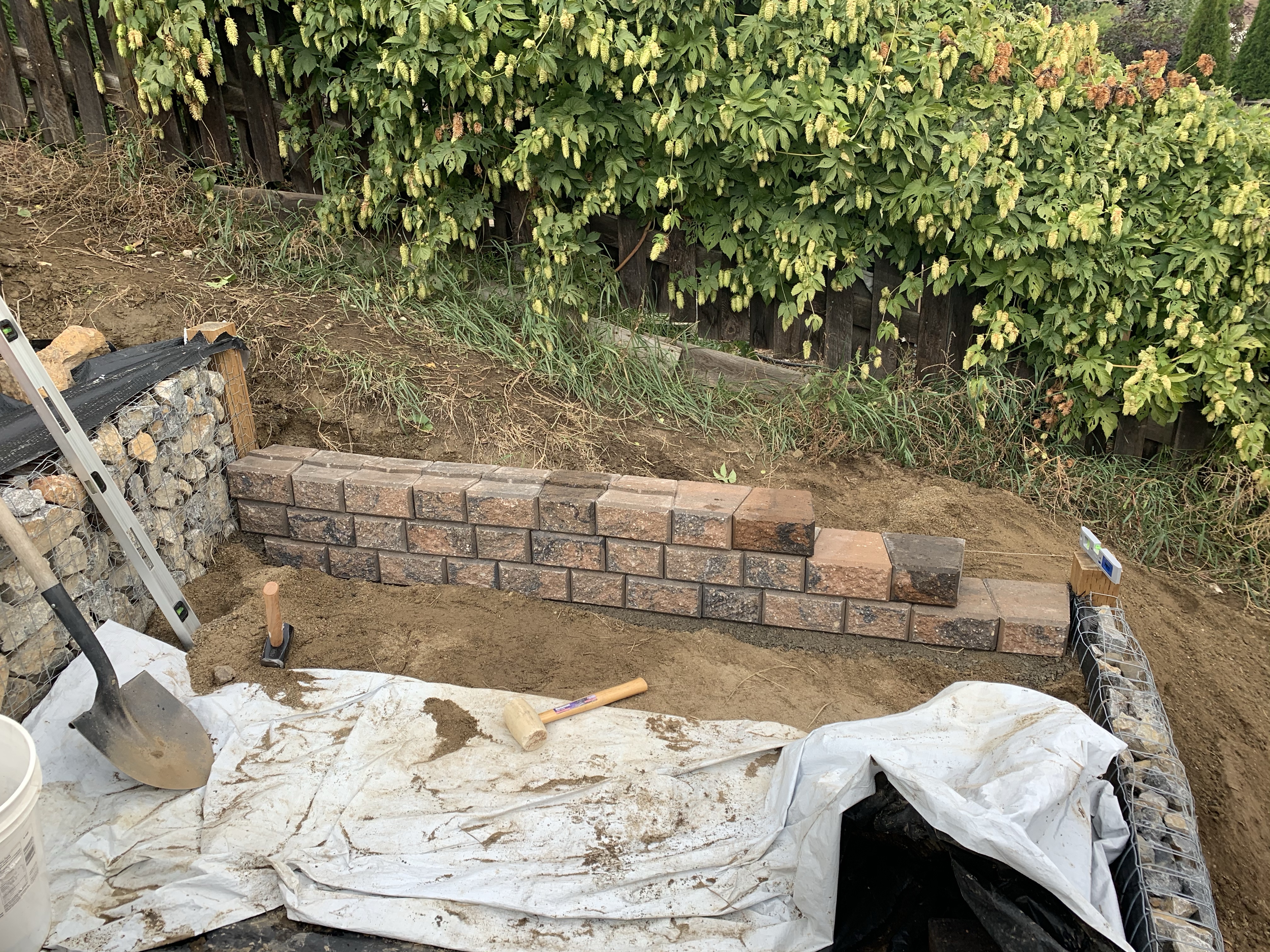 Yesterday we finally had time and the weather to get it done. It always surprises me at hot quickly these walls come together. The most finicky part is the initial level of bricks. Once that is in place and level, the rest just stack up. We stepped them up since they run along the path on the left side and go from one wall to the next above it. The wall will work to keep our path in place, but also retain our garden soil. The walls themselves look a little large, but two layers will likely be under soil by the time all is said and done.