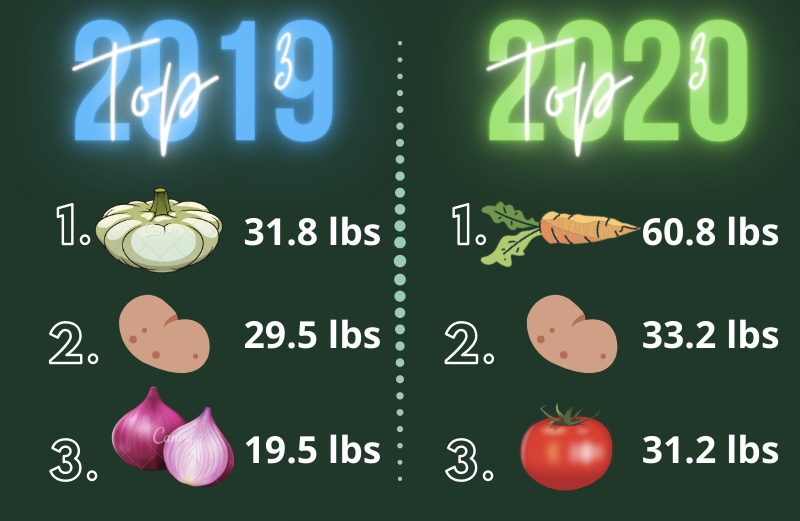 Our top three producing plants for 2020 greatly outweighed our top three producing plants of 2019. The top 3 from 2019 produced 80.8 lbs of vegetables. The 2020 top 3 produced 125.5 lbs. there was also a change up of 2 of the three top producing plants this year, with potatoes coming in at the number 2 spot both years. The 2020 carrots and tomatoes overtook the 2019 Peter Pan squash and onions.