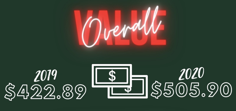 Keeping in line with the overall weight, it is no surprise that overall value also came in higher in 2020. We saved an additional $83.01 in 2020.