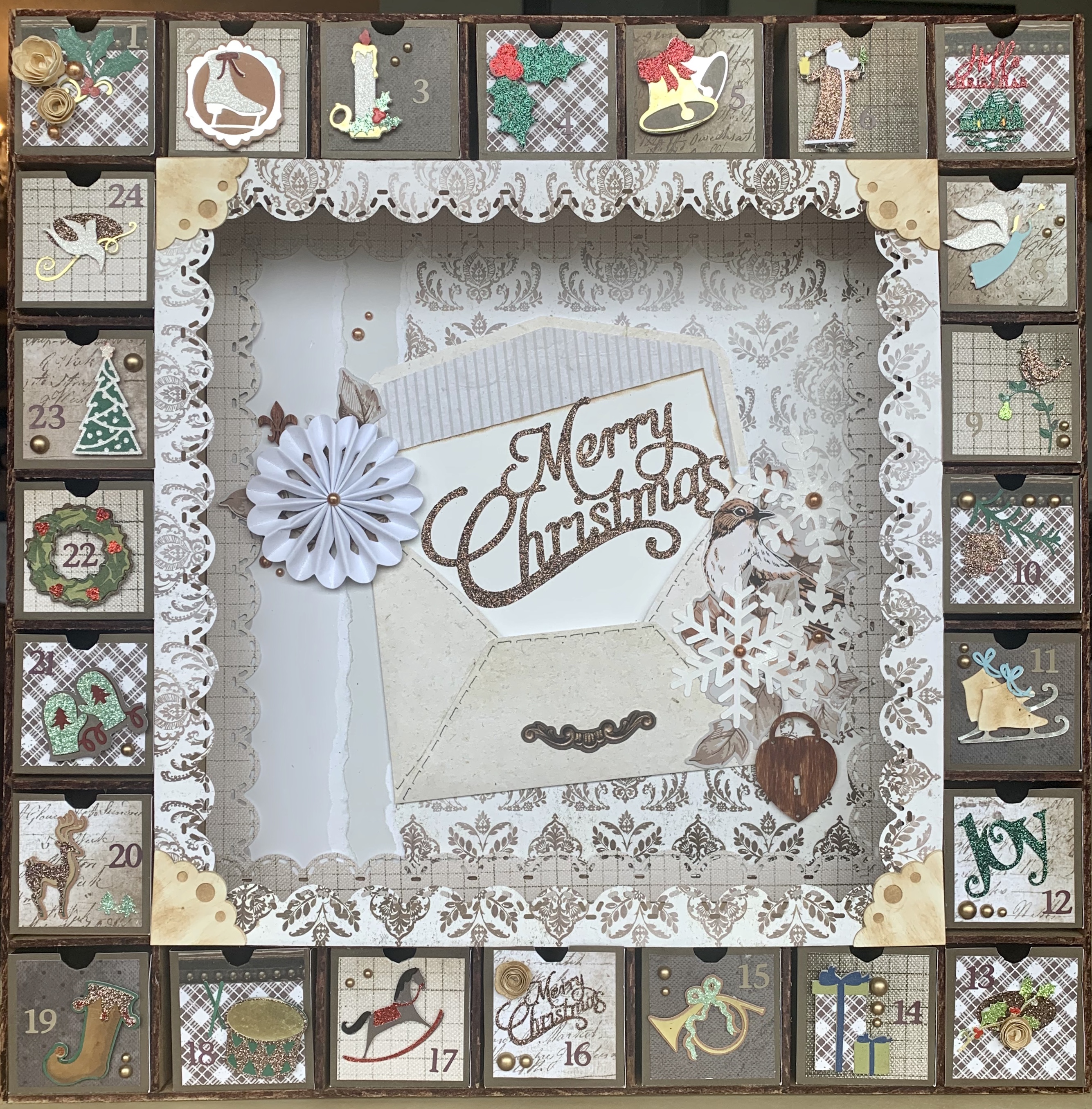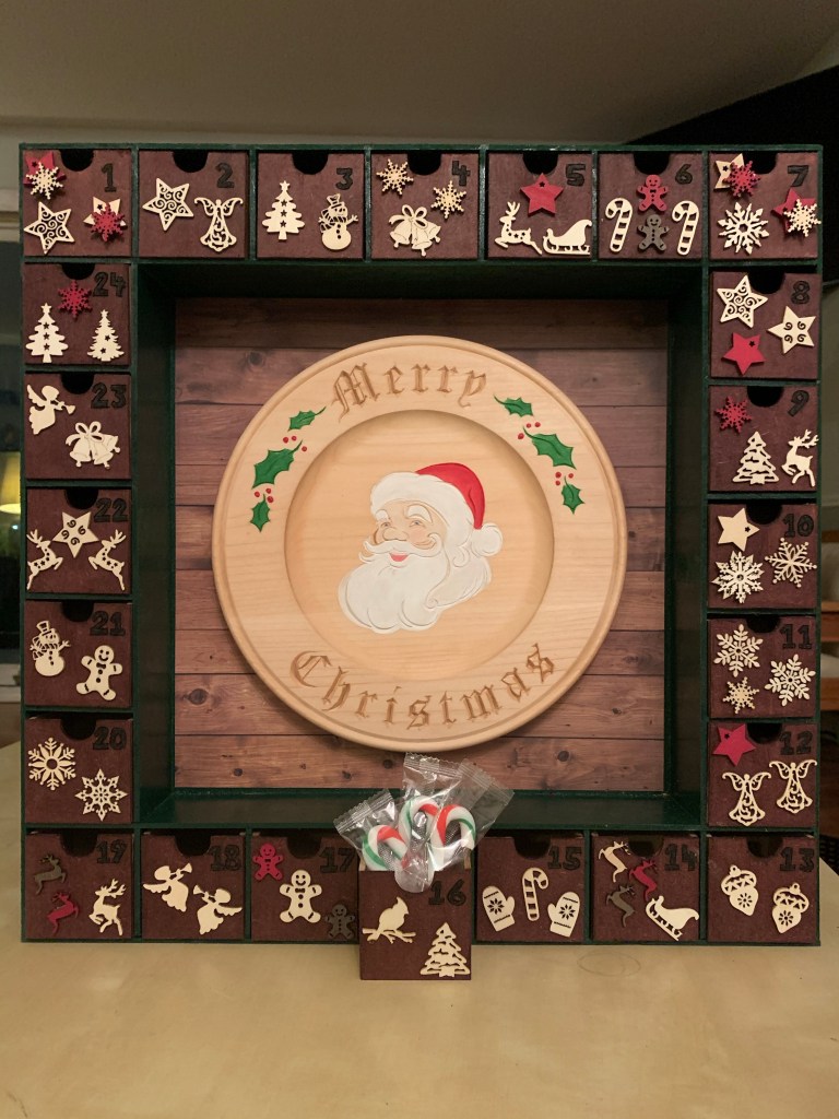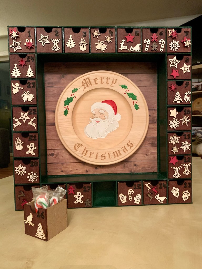 While having my Saturday morning visit with my parents, I had mentioned that I was building these frames again and my dad piped up that it would be neat to use one of his carved plates as a centrepiece for one of the calendars. I also thought it would make a unique Advent Calendar so using one of the frames my mother-in-law hadnāt used, I created little wooden boxes and used my dads plate as a centrepiece. It turned out great! I love when I can visualize what I want something to look like and then once I am done making it, it turns out exactly how I imagined it. Dad and I are going to build another one because we were so happy with how it turned out. Now I have all sorts of ideas for different styles of calendars I want to build!