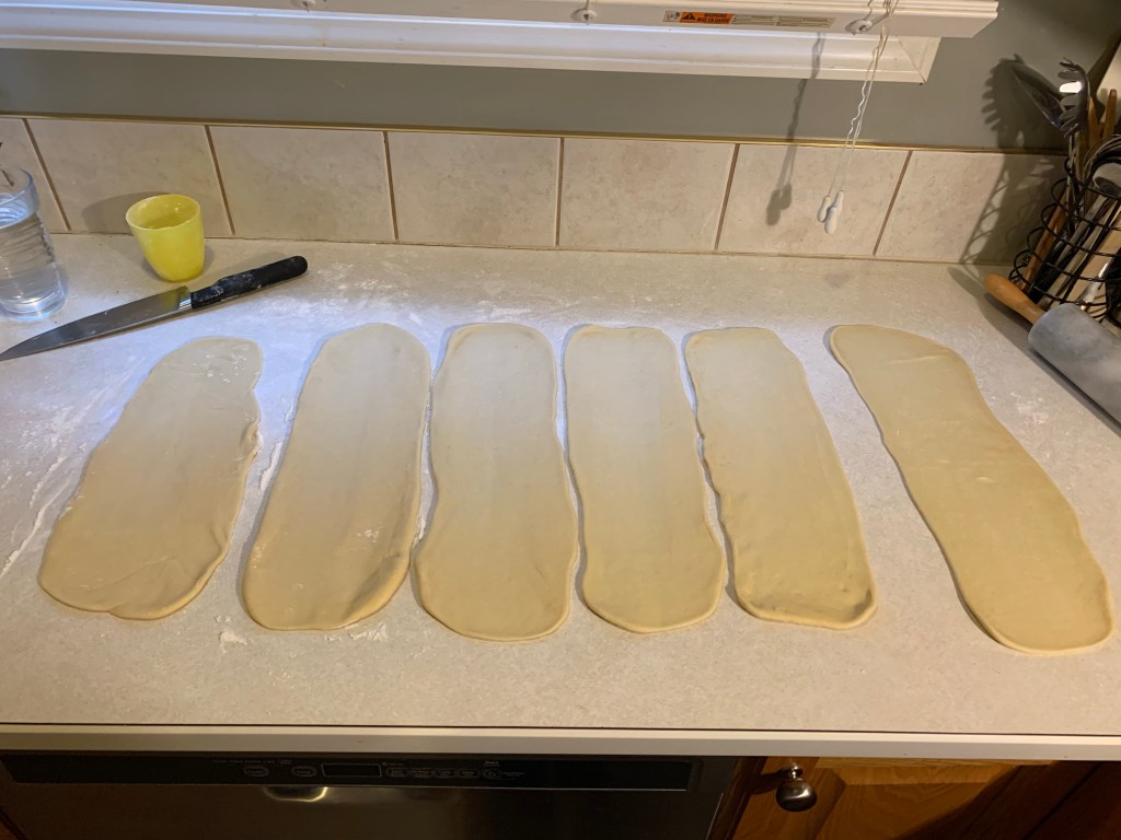 - Dump the dough onto a lightly floured surface. Divide dough into 6 even size pieces. Take each piece, and roll it into a long cylinder. Using a rolling pin, flatten each roll into an oblong, flat sheet of dough about 14 x 5 inches.