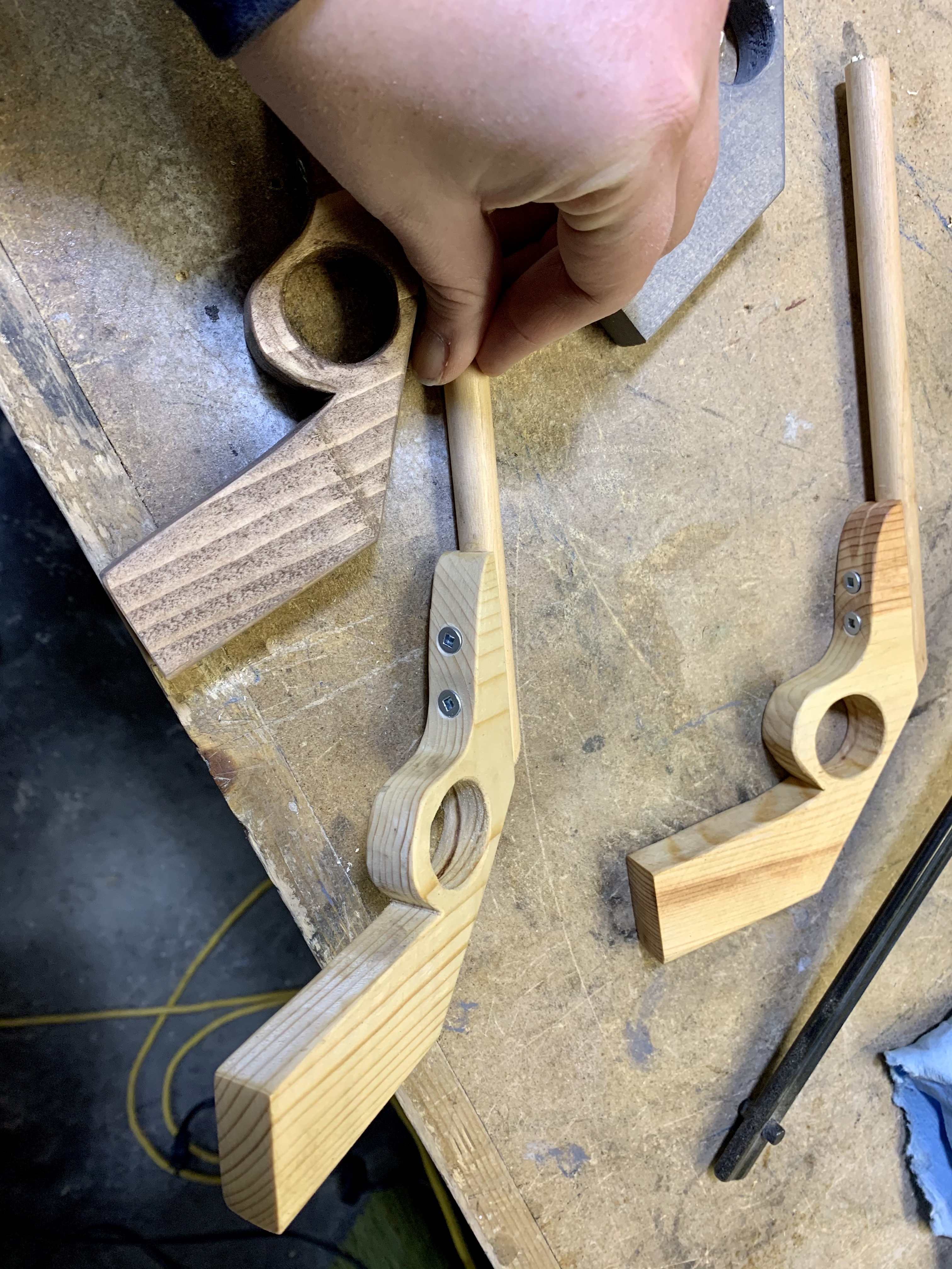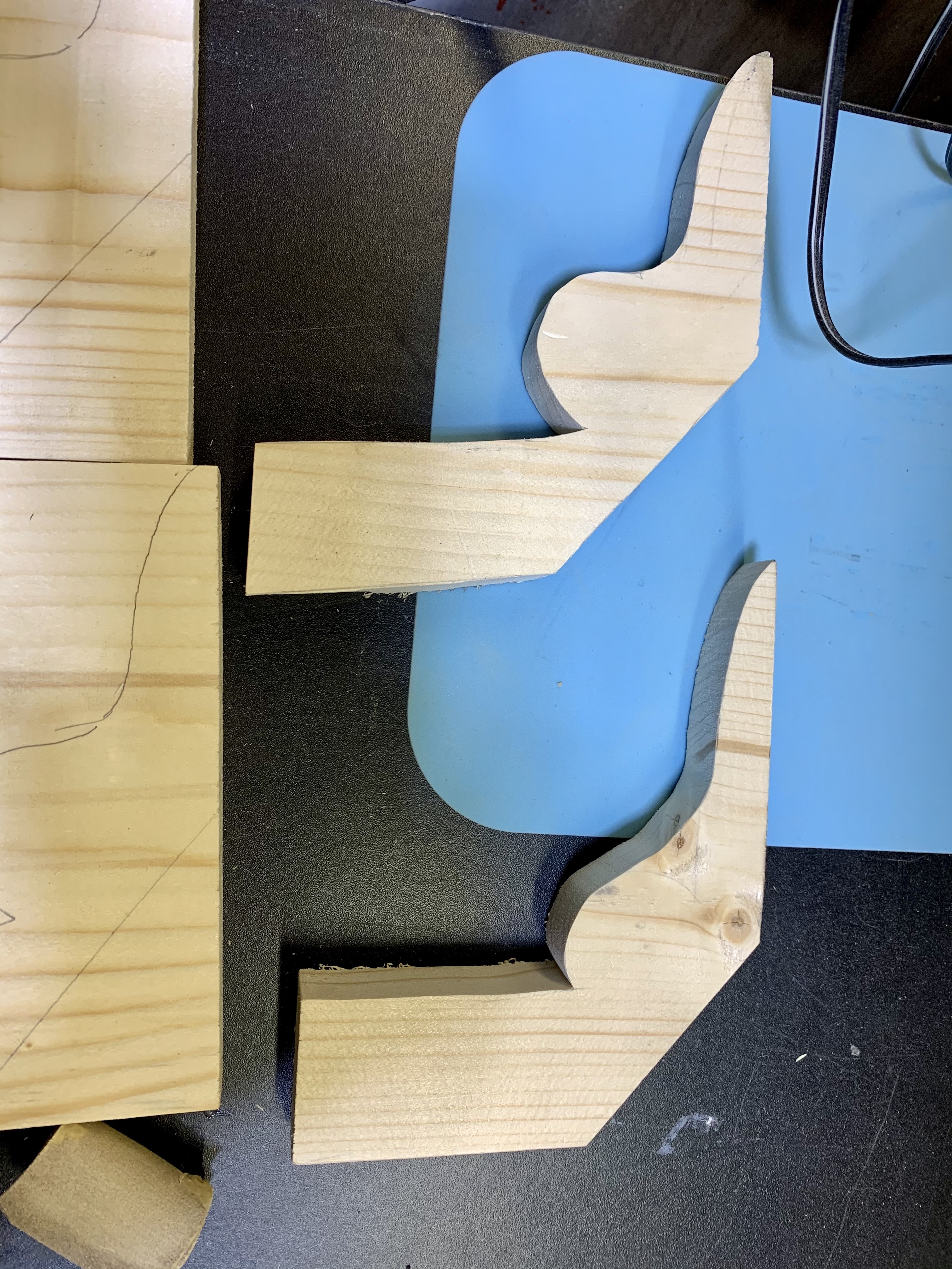 I started off by creating the handle. I used a scrap piece of wood that was approximately 5.5″ wide by 4.25″ high x 3/4″ thick . The back of the handle needed a 50* edge that the clothespin was going to sit on to hold the elastic tight, so I started with that line and went from there. I drew out a rough shape of the handle and used the scroll saw to cut it out. I didn’t love the feel of the first one, so I tweaked it a bit for the remaining ones, adding a little more of an angle to the handle. I figured since I had so much scrap, that I might as well make a few sets. I ended up cutting 6 handles.
