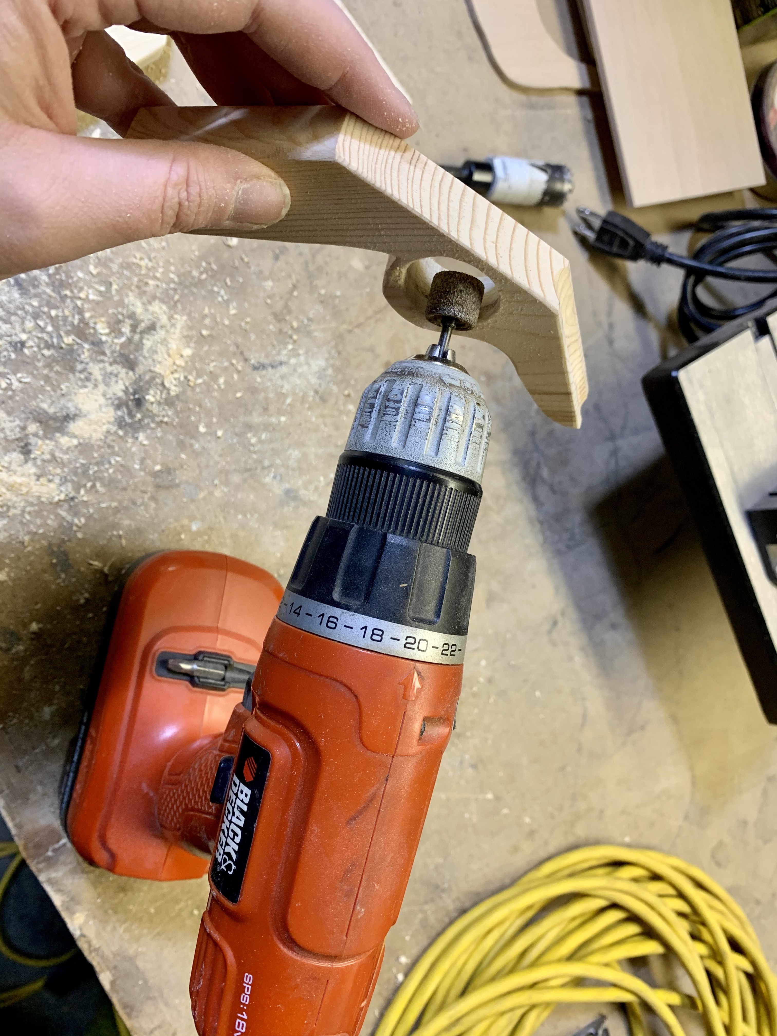 Once all the handles were ready and all the pieces cut, I spent some time sanding everything down. I used my stationary belt sander, palm sander, and dremel/drill to do most of the sanding, finishing off the hard to reach areas with a bit of sandpaper folded and run through. I really need to invest in a spindle sander one day, I do so many projects that could use it, but so far I haven’t bothered. Instead I usually use a sanding bit on our dremel, which works great. Until the dremel died in the middle of this project. I had a feeling it was on it’s last leg, but had hoped that it would make it through the project. Nope. So, I got creative and grabbed my drill, put the dremel bit in and used that. It spun much slower, but still got the job done. I really didn’t want to do it with some sandpaper wrapped around some dowel. Ugh.