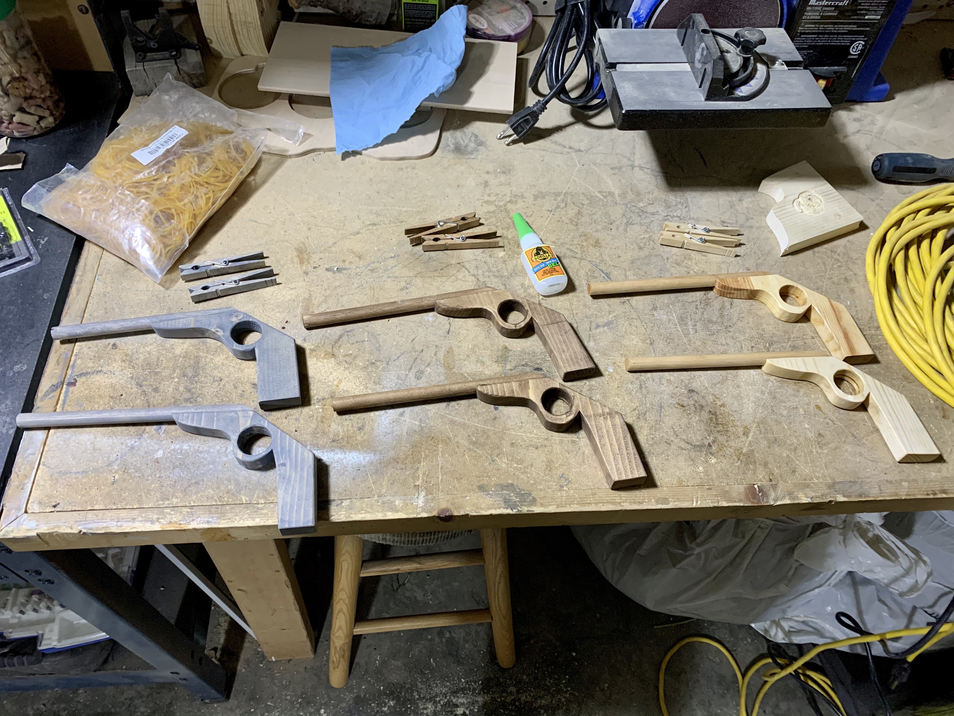 I actually had the plan to build these before Christmas as an extra gift for my nephews, but I ran out of time with all of my other projects and how successful our Etsy site was. If you didn’t get it from the title of this post, I decided to make some elastic band guns with a little shooting target. Silly, childish and absolutely a blast to play with! The best part was that I was able to use a bunch of scraps that were taking up space on my worktable to make them, so really two-birds, one stone.
