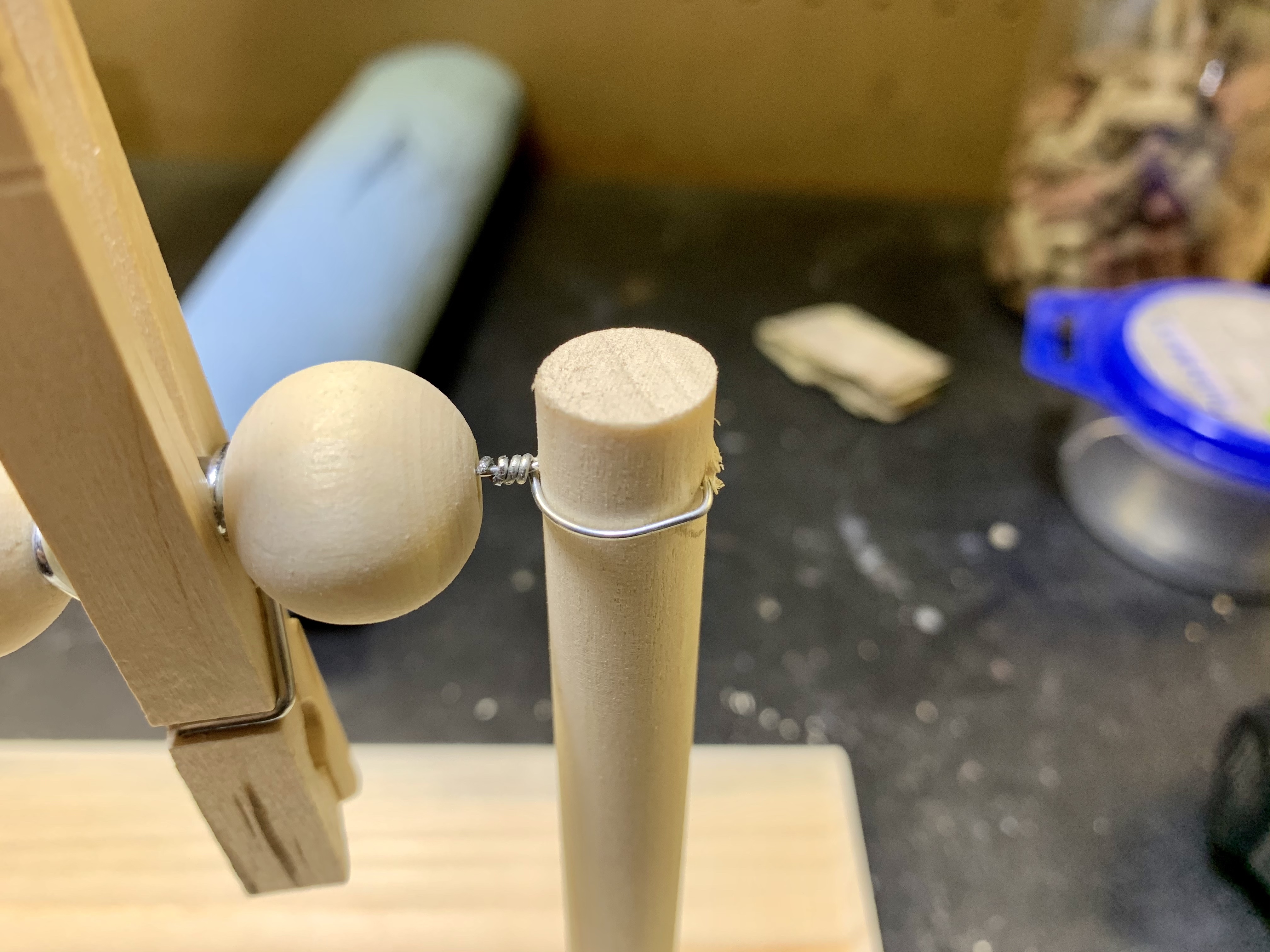 Once dried and strong, I used some thin craft wire to hang the target holders, more clothespins. I started by securing the wire to one side by threading the wire through the hole in the top of the dowel. I then strung the clothespins on the wire using some wooden beads between to keep them from touching the doweling or each other. You could also use tubing, or whatever you have on hand that will hold the clothespins away from each other. Whatever you use, just make sure it is not super tight on the clothespins as you want them to spin freely with little force needed. I strung 4 clothespins across so that there would be 4 targets to hit. Once it was all threaded on, I threaded the end through the other doweling hole, and wrapped it around itself to secure it.
