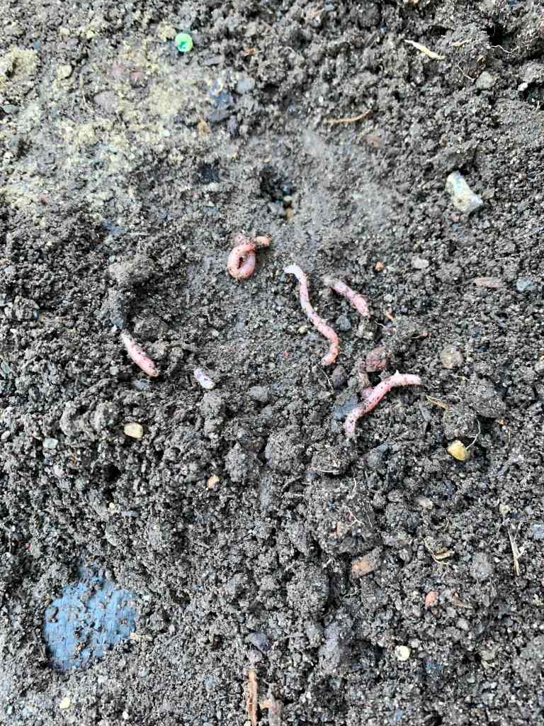 According to our research, worms will do one of two things in the fall. They will either lay their eggs in safe cocoons, buried safe in the soil to weather the winter months, and then they let themselves freeze and die just under the dead foliage; or, they will burrow deep, coil up and cover themselves with a slime that will keep them from drying out over the winter and will hibernate in a sleep-like state called estivation. Once the soil temperatures are right, they will wake up and continue to enjoy the warmer weather and go on with their little lives. This is what we were finding, and unfortunately un-earthing. We were careful to take them over to the new bed and placed them safely under the soil. Once we were done transferring all of the soil and spreading it evenly in the new bed, we re-tarped the garden bed to keep the weeds & birds out, and keep the worms and soil warm. I think that the worms will be ok with the weather now warm. They likely would have awoken within the next week, we just made it happen a little earlier.
