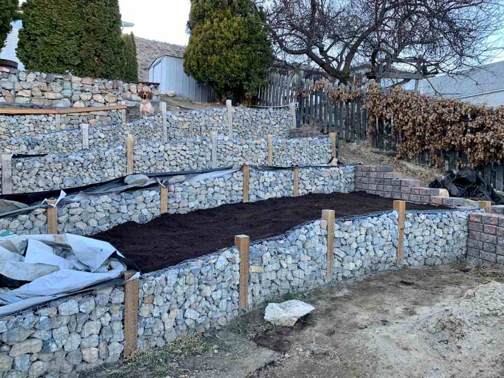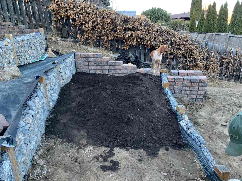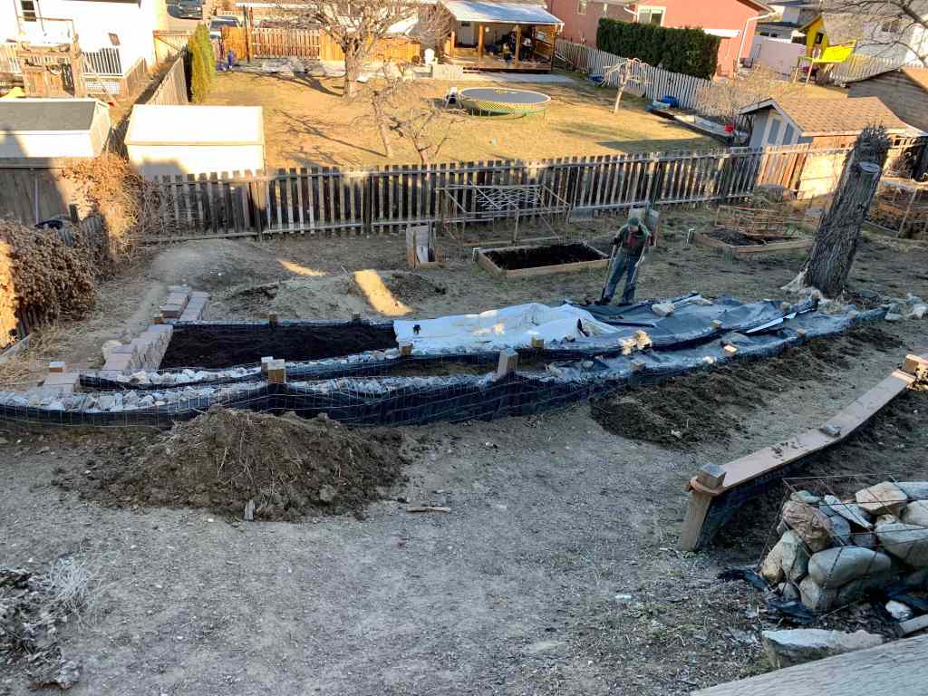 We were about to get started on the really large bottom bed, when we realized that it already had enough headspace to the top of the wall for a decent layer of topsoil. Since we had saved some time in not having to dig it out, we decided to check to see if the raised bed closest to that section of wall had thawed enough that we could transfer the soil over. Low and behold, it was essentially all thawed out with the exception of a patch about 1″ deep at the very bottom. So, we started moving all that soil over. Kurt ended up needing to relax for a bit and I took over. We didn’t want him to overdo digging again and hurting his back, and he had already moved a large amount of soil in the morning (I’ll get to that in the next blog post).