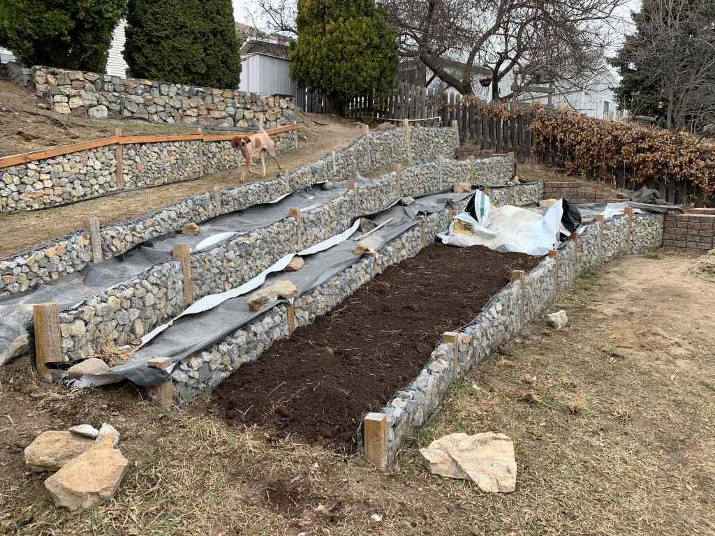 Although the last 1″ of soil was still frozen, we were able to pull up on the landscaping fabric to break it up and move it over to the new beds. We thought we might have to leave the last little bits to finish thawing out, but the landscaping fabric that we have been using is extremely durable and strong, so it didn’t tear as we lifted it and broke up the soil. Unfortunately, the second bed still had a lot of frozen soil. It must not get as much sun as the first one we emptied, so it will be a few more days before we can finish emptying that one. We did manage to get the full bottom wall bed filled and started filling the upper one as well. With the remaining soil from the bed, we should be able to transfer that to the upper wall bed and fill at least half of it, if not more.