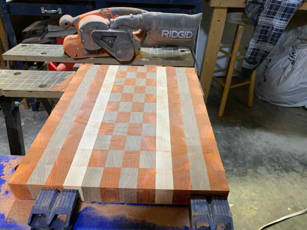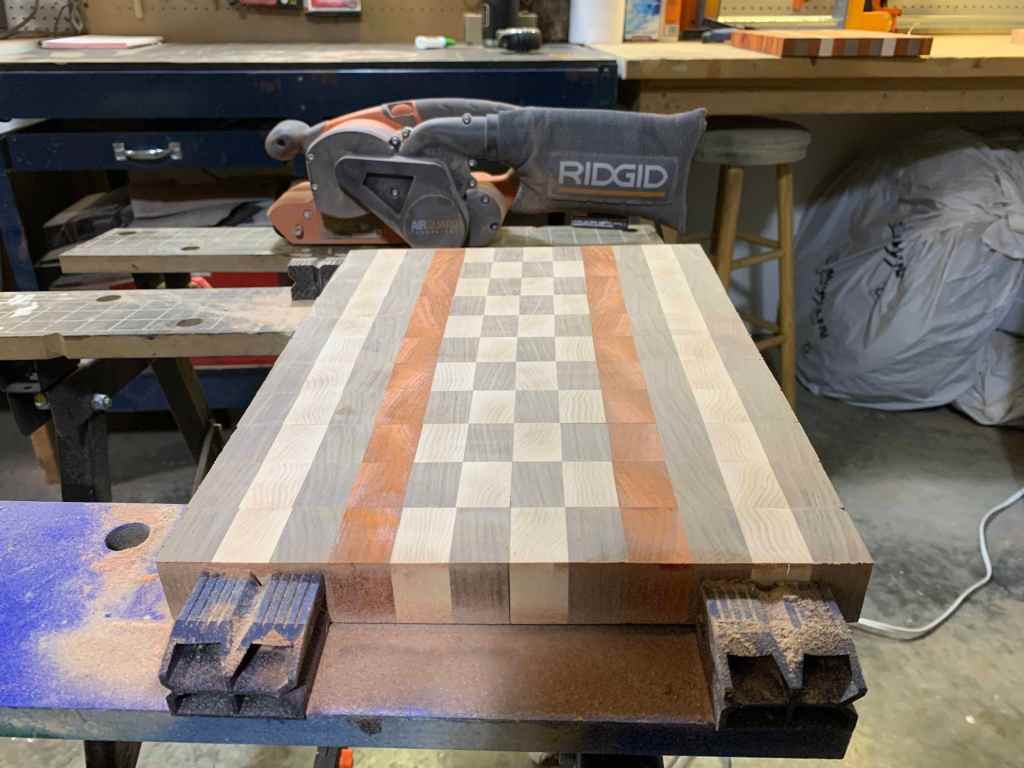 Sanding, sanding, sanding, sanding, sanding and more sanding. End grain is the hardest part of wood and sanding it is tedious and long. You don’t want to force the sanding otherwise you will have even more work as you go from coarse to fine grit. The end result you want is a super smooth, glassy surface. Digging in with the coarse grit to try to move things along, only means you will need to spend more time getting those marks out with the fine grit paper. I use a belt sander with 80 grit to start. I then move to 120 grit on my belt sander. From there I switch to my orbital sander and use 180 grit and then 220. I know some people got to an even finer grit, but I have found 220 is more than sufficient.