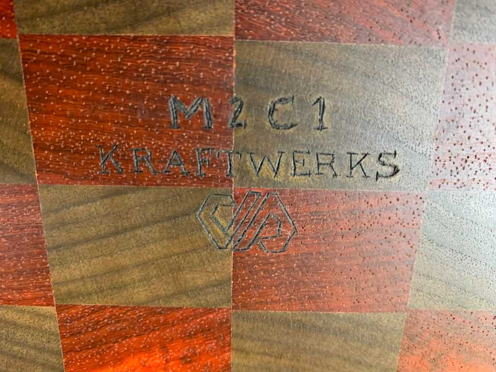 The boards are almost done! I add handles into the sides with my router, for easier lifting. There is usually a little extra sanding that needs to be done after this step, but it is usually minimal. I also like to wood-burn in our M2C1 Kraftwerks name as well as a JP initial to brand the board. I put that on the bottom side. Once that is done, I give them a good soak in some fractionated coconut oil and beeswax, layering it on thick and then leaving it for a few hours so that the board has time to suck up as much as possible. I then buff it to a nice glossy sheen. My last step, and it is very much a personal preference, I add some rubber feet to the bottom. I do this because I make these as a permanent fixture on the counter, and it is nice if it has a little grip to stop it from sliding around. It also helps keep the board out of any water or juices from carving meats. I personally haven’t done a juice channel in any of my boards, but I may try it out in the future.