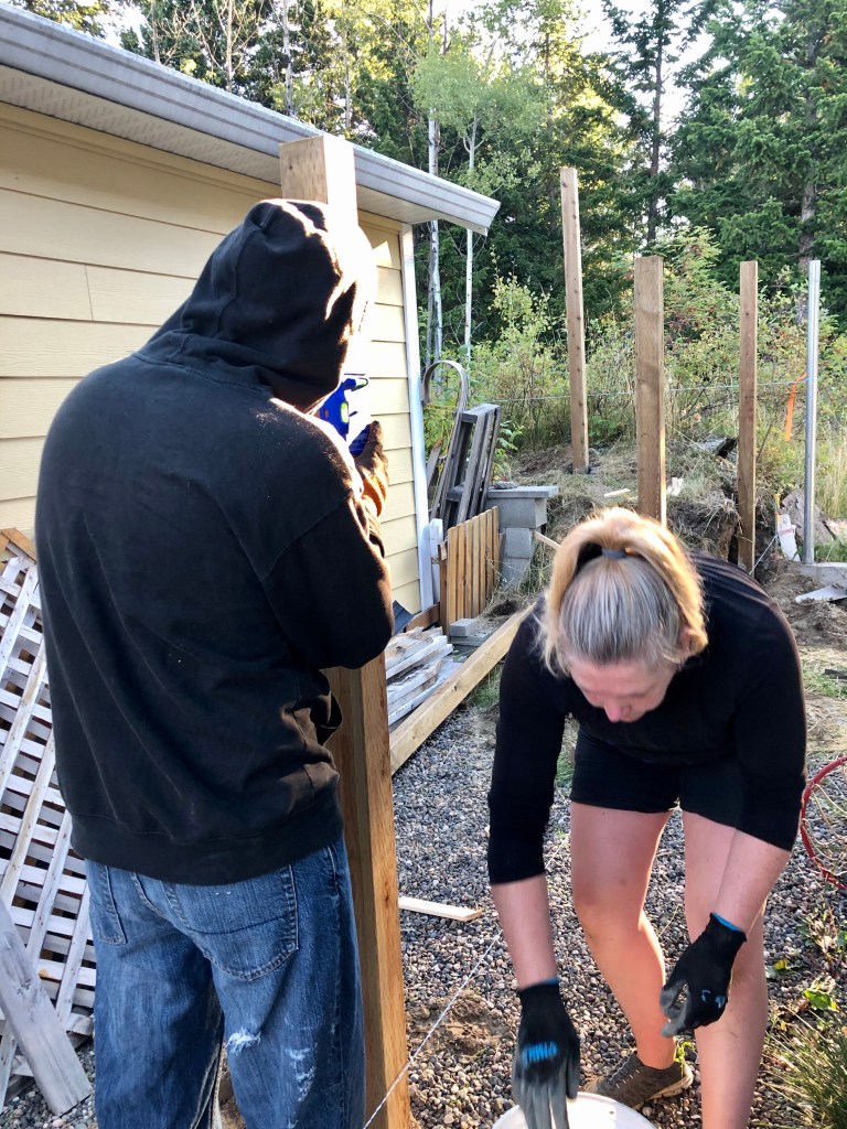 Although you can manage this step on your own, it really is easier and faster with 2 people. 1 person to ensure they are holding the post level and the other to pour the cement. You can also use scrap lumber and stakes to hold the posts in place while you cement. Depending on your cement mixture, you may need to do this to brace the posts while the cement cures. We keep our mixture like a thick porridge and found we did not need to let the cement cure. The posts did not move at all.