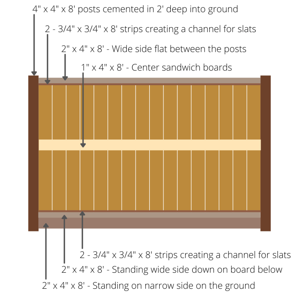 You will want to make sure that your post holes are not going further apart than 8′ to ensure that your wood will properly fit between the posts. If you end up with a longer distance between, then you will be running to the hardware store to get 10′ lengths of 2×4.