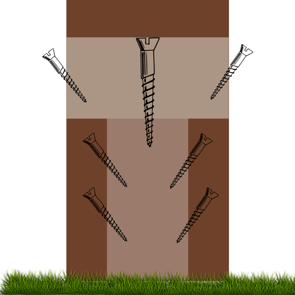 As you place the first board, on the short side, creating the bottom part of the “T”, you may have to dig out a channel to ensure it is not high centred and sits at a specific point on each post. Using 4 screws per end, toenail the screws through the end of the 2″ x 4″ x 8′ to secure it to the post.