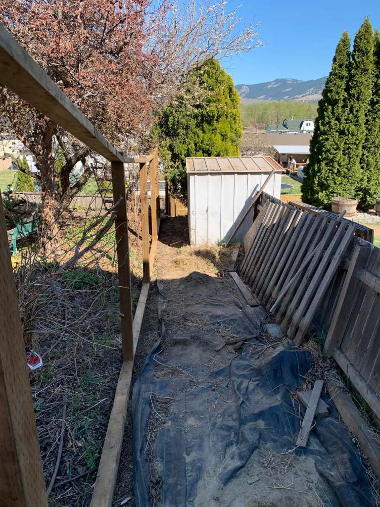 For the bottom part of the frame, you are going to create a “T” with the 2″ x 4″ x 8′. Measure the distance between the base of the posts and cut 2 of the 2″ x 4″ x 8′ to the correct length. Note, that if you are on a steep slope, you may need to cut your 2″ x 4″ x 8′ with an angled end instead of flat. I am sure there is a proper way to do this, but we did it by holding the boards against the post and using a sharpie or carpenters pencil (thick lead) to draw the line on, capturing the angle that it needed to be at. It worked like a charm and we didn’t end up with any boards that did not fit. On the odd one, we had to shave a little of an end to get the fit snug but not pushing on the posts.