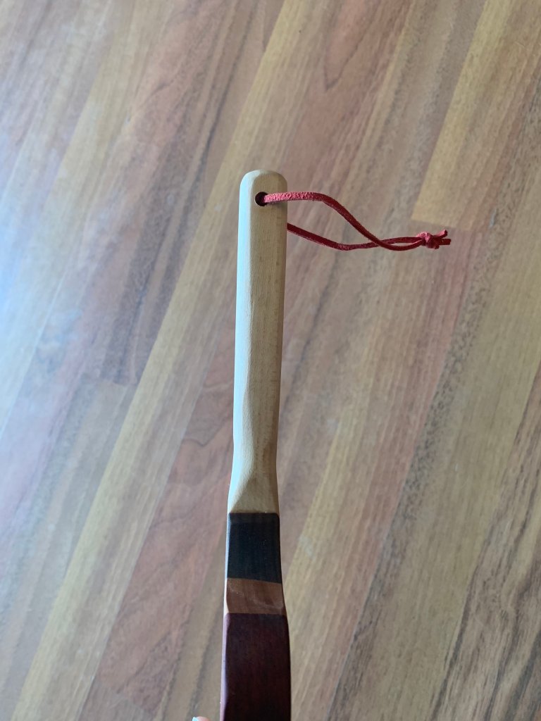 Next, I started to think about the shaping. The first one I shaped was the Padauk, red grandis, walnut, maple board and it ended up as the paddle. I rounded the end, and the corners on either side of the handle. I used the scroll saw to get the general shape of the board on either side of the handle prior to sanding. Next I rounded the handle for a comfortable hold, rather than the planer sharp edges that it originally had. I did all the shaping with a belt sander, palm sander and random orbital sander. Not having a lathe, meant that I had to shape the entire handle with sanders, which actually turned out to be easier than I thought it would be. I used my belt sander to do the bulk of the shaping, then the palm sander in the areas that the belt sander was to bulky to get into.