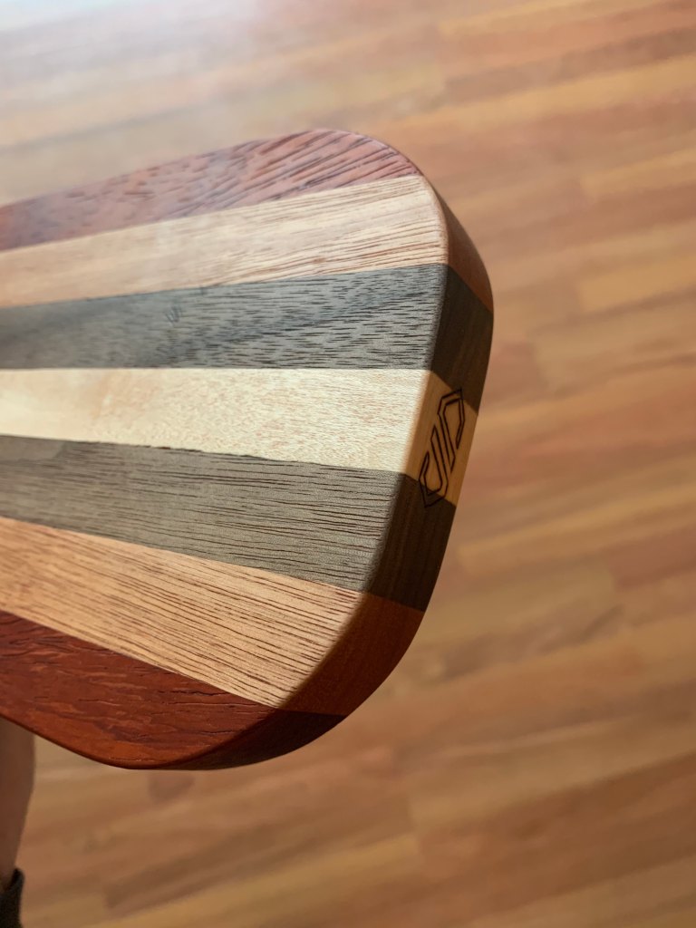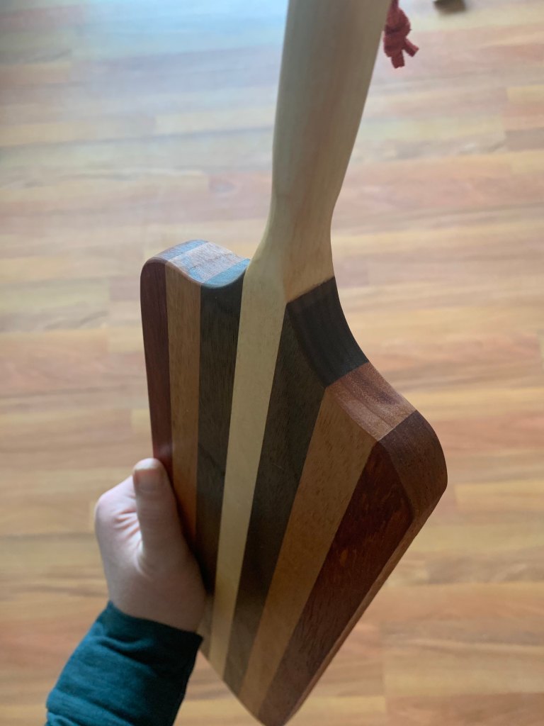 I did a variation on the other three boards. The largest one I rounded the most, so it has a but of an oval shape. The walnut, red grandis and purple heart ended up with a boxier shape, only rounding the corners slightly. Then I really experimented with the walnut, red grandis, padauk and maple one, cutting out a few chunks with the scroll saw to give it some funky curves and points. It turned out fun, but I am not sure if I would do it again. Seemed a waste of some really good wood. I think if I want to do a funky shape, I will use some smaller lengths, add it to the paddle and then sand those areas flush with the board.