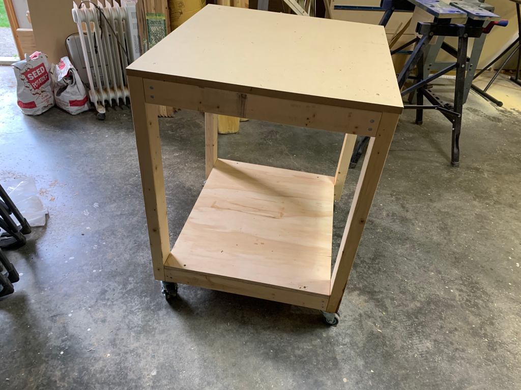 Add the top to the stand and a shelf if you would like one. Now that you have the casters on, place the stand on the ground to ensure everything is square and level. You will want to do this on a surface that is level. Unfortunately my shop has some discrepancies in the level so in some areas my stands wobble a little, in others it is solid and level. Fun! Once the tools were added, the weight helped get rid of that minor wobble in certain areas of my shop.