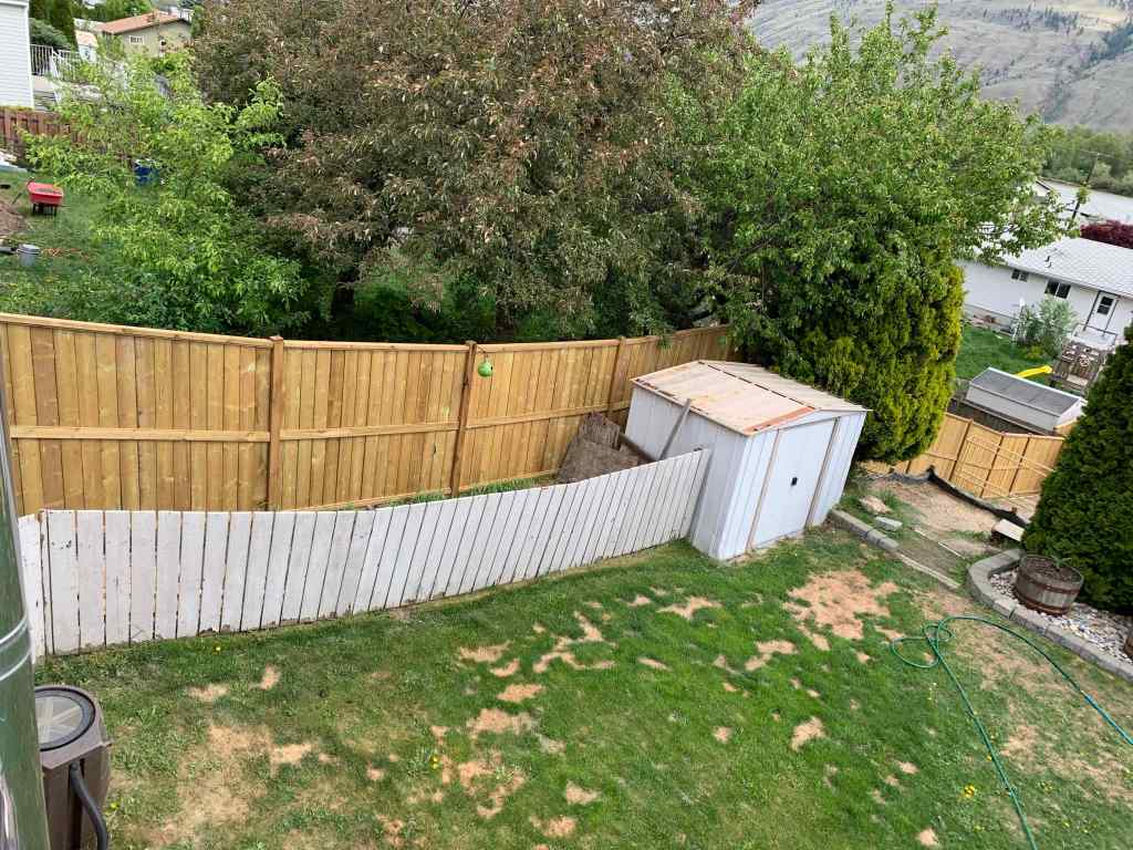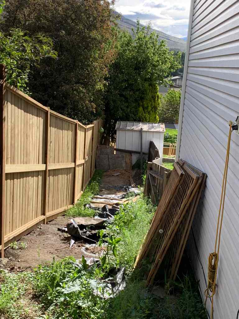 We have been enjoying our new fences for a month now, and do we ever enjoy them and the privacy they have provided us! The only problem is that when we were building it, our secondary fence that runs from the shed to the corner of our house seems to have bit the dust. It technically is still standing, but barely and only because it is propped up against itself. A few of the posts are actually completely broken off. A good windstorm may knock it over.