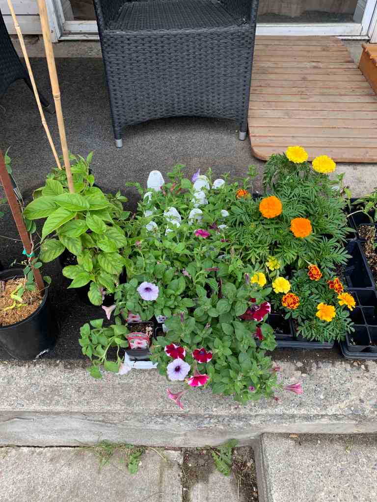Now that almost all the veggies are happily in their beds, it was time to change our focus to our planters and getting some colour popping against all the greenery. Although we added marigolds to our garden beds this year, that was more out of hope that they will help deter some of the pests that can cause issues with our veggies. It is really nice to see pops of colour throughout the garden though. More colour will come once we start seeing more strawberries, tomatoes, peppers, squash, sunflowers, etc, etc, etc.