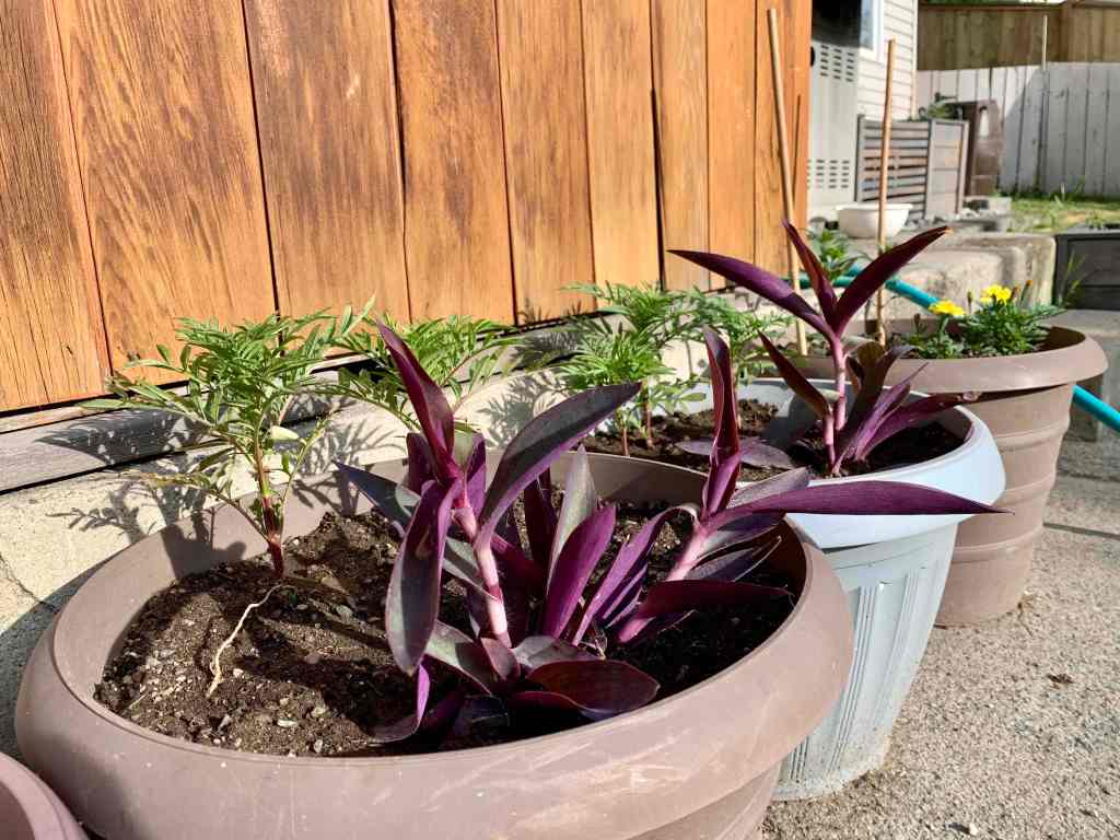 On the other side of the top part of the back yard, is where we have a cement patio area. In this area is our BBQ, our hot tub and a patio table and chairs. Beside it is where I built some planters to hide our air conditioner. Those planters have been taken over this year by herb gardens, so a little less flowers, but hopefully a little more variety to the lovely smells of the back yard. Also, maybe a little bug control as well! In front of our hot tub, I usually have 4-6 planters that help bring a splash of colour to that area. This year we went with 4 planters, lined up in front of the hot tub. The cedar planks around the tub, offer a nice backdrop once the flowers grow taller. In the two centre planters, I have purple heart in the front and a few leftover marigolds in the back. The two outer planters have snapdragons in the back and some marigolds in the front. The snapdragons are our favourite variety from last year. They are a salmon colour flower with orange and yellow as it approaches the stem. Very colourful and the bees seemed to love them last year.