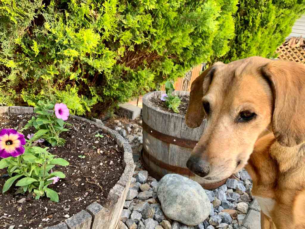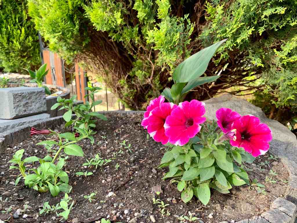 In the top portion of our backyard, we have 6 wine barrels that we always have overflowing with flowers. We also like to bring some height to the colour, so our go-to in those planters are always some canna lilies at the back. This year we did a mix of yellow and red, which should add a nice variety against the backdrop of the cedars. Around them, we have planted a variety of supertunias with lots of interesting colours. They go from standard solids like red and blue, to unique flowers that are a mix of green on the outside with a purple centre, or a purple outside with a yellow-green centre, to others that look like they are almost white with vibrant colour outlining the veins in the flower petals, to candy cane flowers. We have done these a few years in a row. They offer a lot of colour, grow fast and cover a lot of ground, and they don’t need to be deadheaded. By late summer, they are often just about touching the rocks that we have filled the old garden bed with. The contrasting colours and texture is one of my favourite areas to just sit and watch.