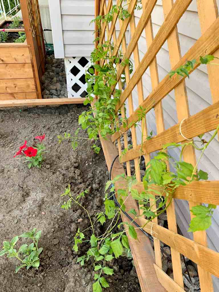 Around the base of the vines in the front planters, we have added some more supertunias to overflow and provide event more colour. They will also help keep the roots of the vines shaded during the heat of the summer. Our front yard gets HOT during the summer, with the afternoon sun in full force like a laser beam. The supertunias did great last year out front, and these vines all like full sun and can handle the heat. The benefit of it all, is that they have irrigation run to each planter to ensure the soil gets a really good soak each night and the supertunia coverage (once grown a little bigger) makes sure the sun can’t suck that soil dry during the day.