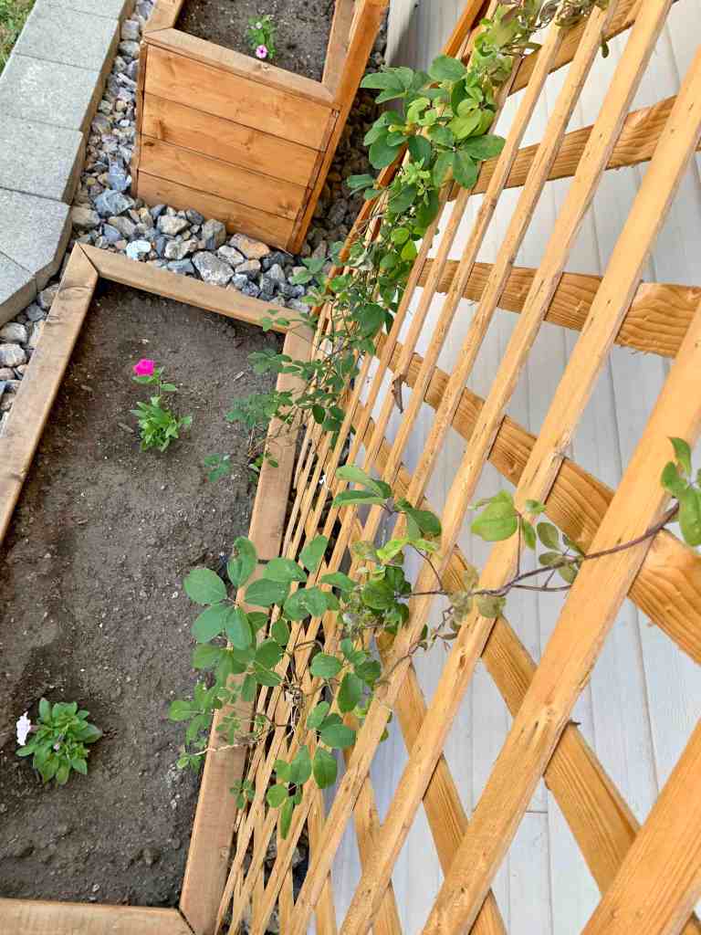 Now onto our front yard. Last year one of our big projects was revitalizing the front garden beds by removing the junipers, creating a rock garden bed with large planters for our flowers. We tried out clematis last year, with the hopes that we could help them winter ok. That unfortunately, didn’t work out. So this year we decided to aim for some hardier vines that are going to be more likely to winter well. With some help from one of the staff at a local nursery, we went with white trumpet vine (Campsis radicans “flava”), chocolate vine (Akebia quinata) and kiwi grape vine (Actinidia arguta issai). The trumpet vine and chocolate vine are very similar with similar looking flowers, just in different colours, and slightly different leaves. All three are good for zones 4-9 and we are in zone 5, so we should be good. Because they are in planters and not in the ground, we do plan to do some extra insulation for the winter to help keep them going. They are all also aggressive growers, which is something else we were keen on. We want them to fill out the trellises for a nice lush look at the front of the house. Especially considering we plan to get rid of our front lawn eventually to make a little more room for guest parking. We live on a frontage road, so our front yard is loud with traffic and un-enjoyable. We will save the water for our backyard oasis instead.