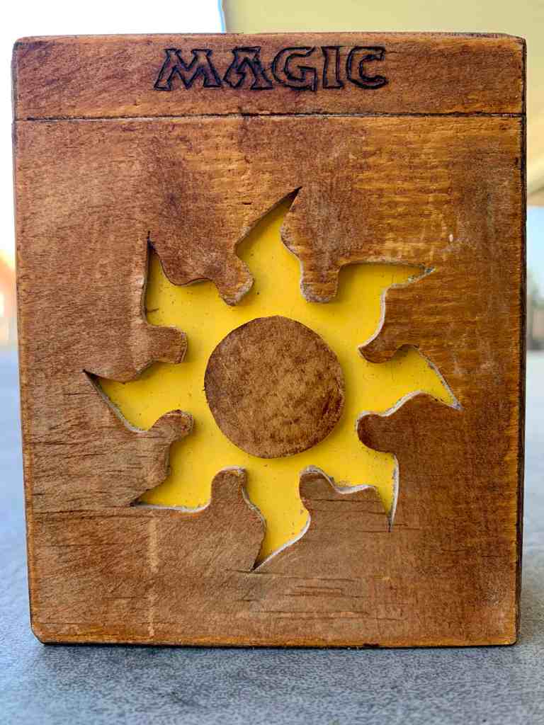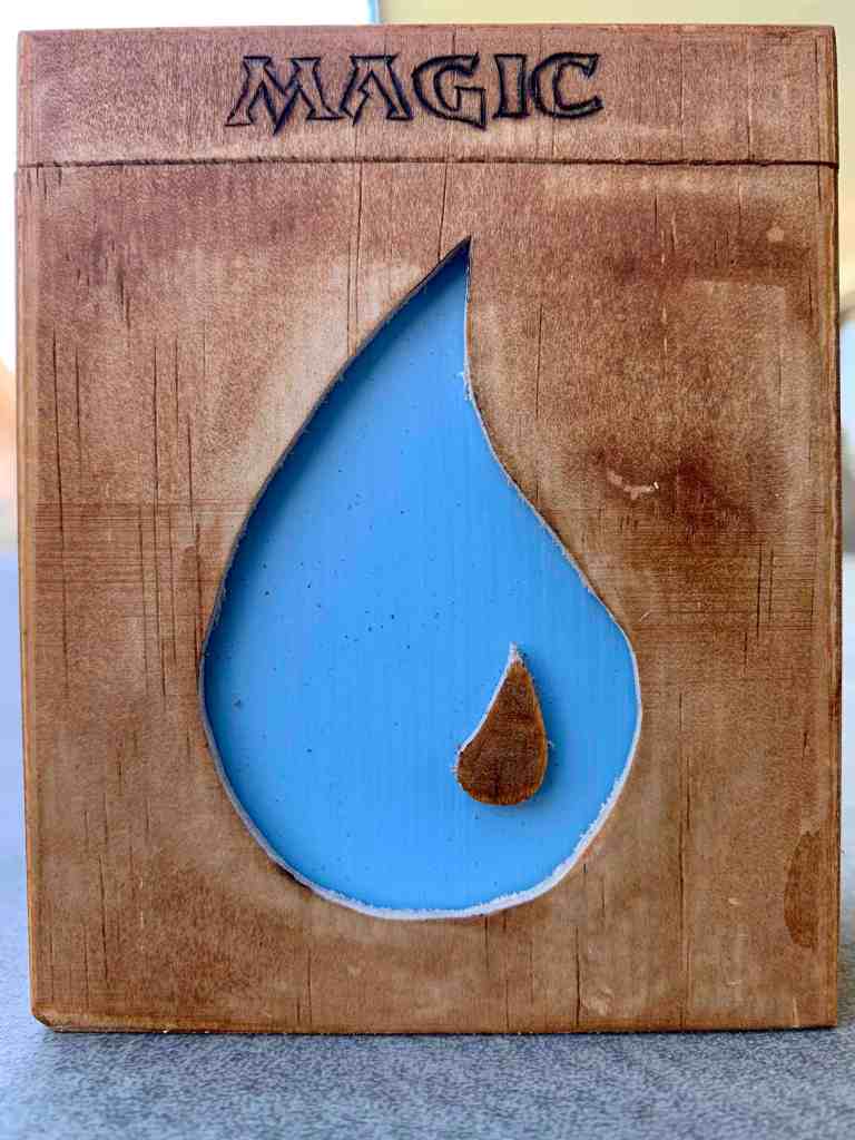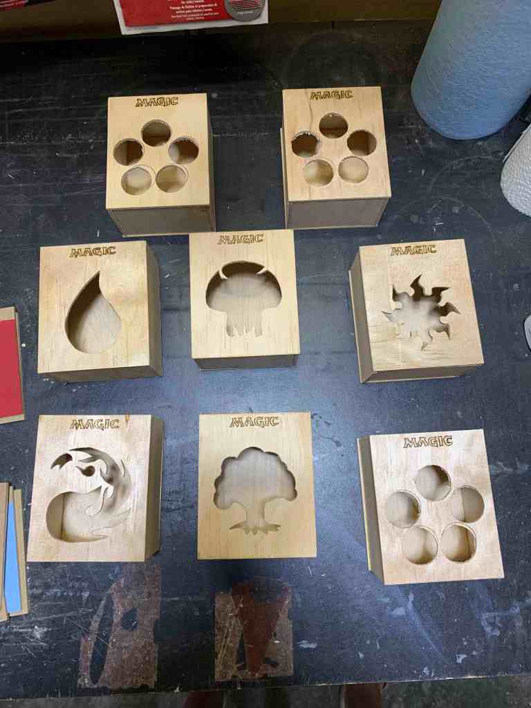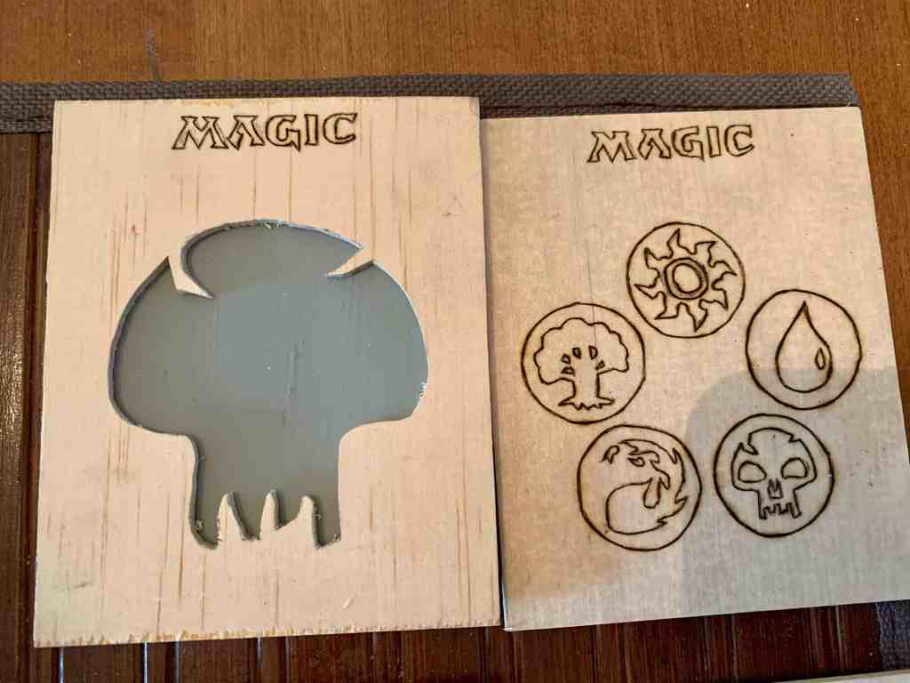 The next step was quite tedious. I love my scroll-saw and really enjoy using it. However, for something like this, it would really be nice to have a laser cutter/burner to make the process faster. Especially if I were going to sell these. At this point, all of my finished boxes are spoken for, but I will have to decide if I am going to make more to sell. I know my brother-in-law has already mentioned them to some of the other Magic players he knows, so I may be making more based on requests. We will see. Anyways, my next step was scrolling out the larger symbols and then using the wood-burner to add the embellishments of “Magic” and the 5 symbols on the back panel. I also painted the inner box sides that was going to be the backdrop for the symbol. I wanted them to pop, so I added the colours that the symbols are supposed to be. For the smaller 5-circle versions, I wasn’t sure if I was going to paint the symbols but after testing it in the box without the colour, felt that the design didn’t have enough POP to them.