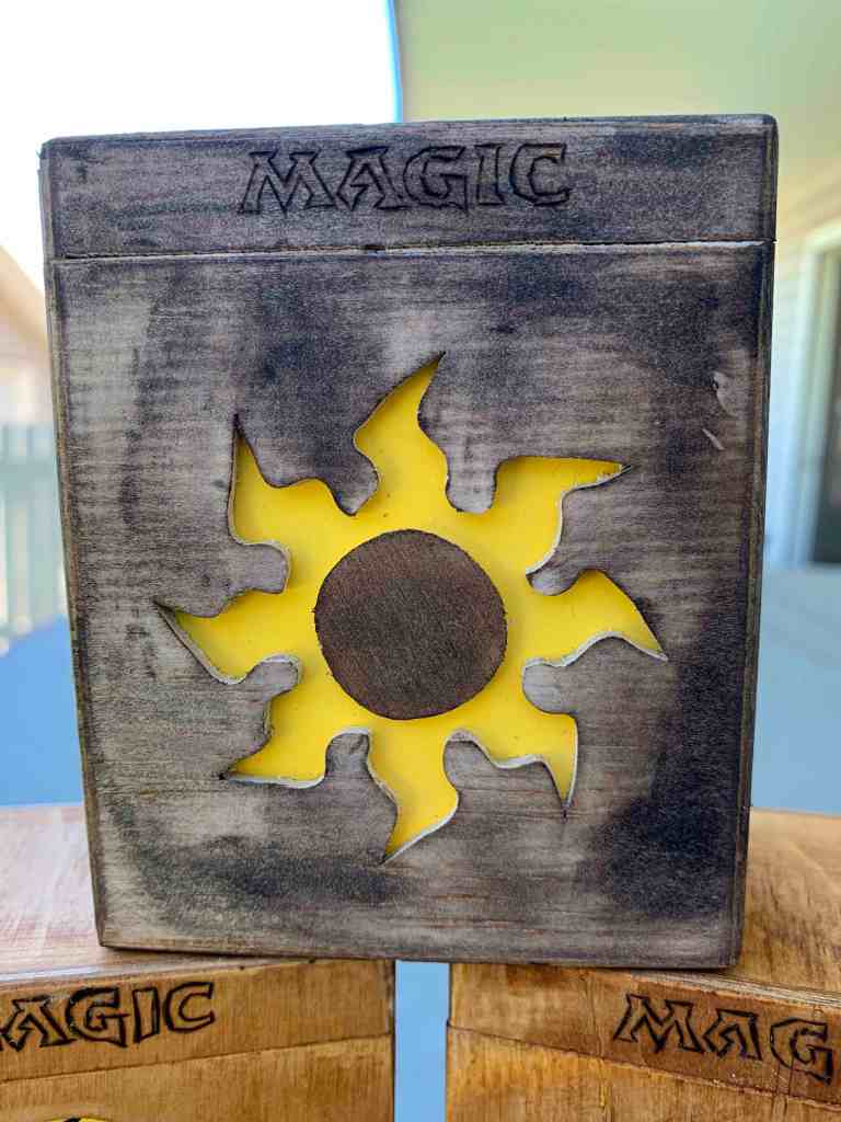 The last step was to add a stain to the box. Although I like the natural colouring, I thought a slightly darker stain would help those symbols really pop. I had a dark coffee stain that I had used on some larger projects and it gave a burnt/antique look to those projects. I thought it would be perfect for these boxes since the cards themselves have a bit of a “relic” look. WRONG…so wrong. It was awful. In retrospect, I should have tried it on the box that already had a mistake on it, but nope…I used one of the symbol boxes, which would be part of a set. Ugh. So awful. Anyways, I switched to the ipswich pine stain, and it was so much better. It still let the colours pop, but also let the pyrography shine through as well. In the end, I was able to sand the stain of the one box and re-stain it with the pine to match the others. Whew.
