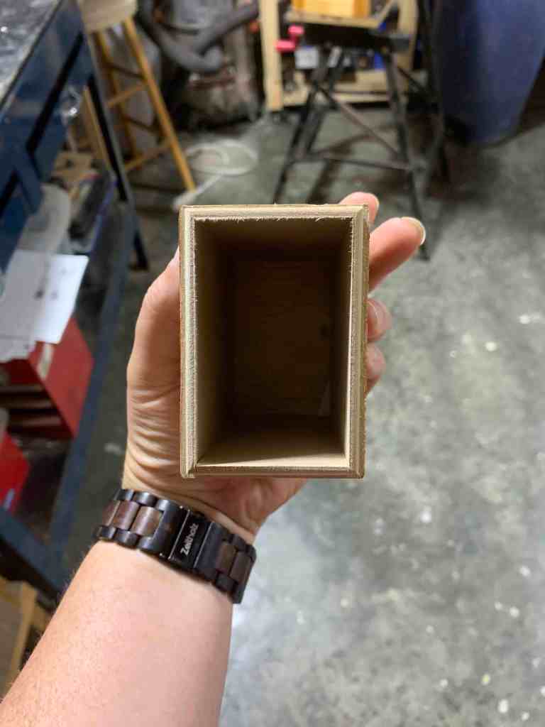 Once dry, it was time to cut the lids off. I have never done boxes this way that are so small, so I didn’t want to use my table-saw. A little too close to the digits for comfort and I couldn’t think of a quick jig that I could setup. So I decided to try my mitre saw….not such a good idea. I mean, it worked for the most part. A nice clean cut, straight line….but just as the lid came off, it spun a bit and the saw blade bit into the corner tearing a bit of the lip of the lid off. So that was scratched as my option. Eventually, I decided to use the bandsaw. Not as nice of a cut, however it worked like a charm and a little sanding cleaned up any of the rough edges. Be careful with sanding though, you want to keep testing your lid to make sure it lines up nicely with the bottom portion of the box.