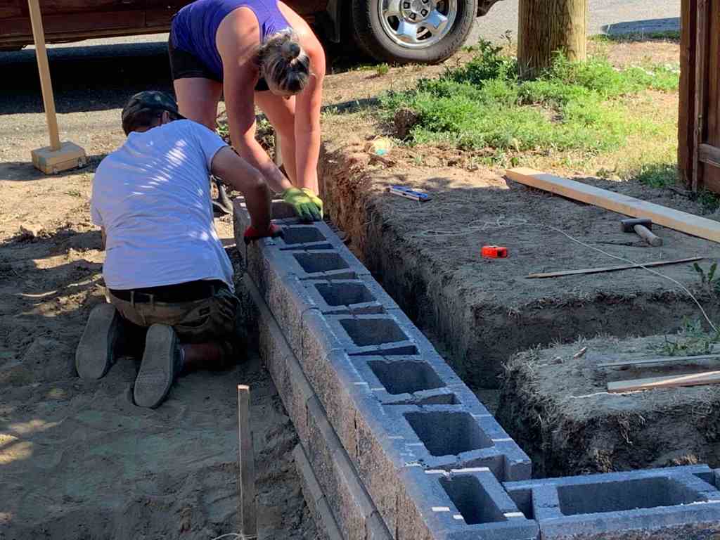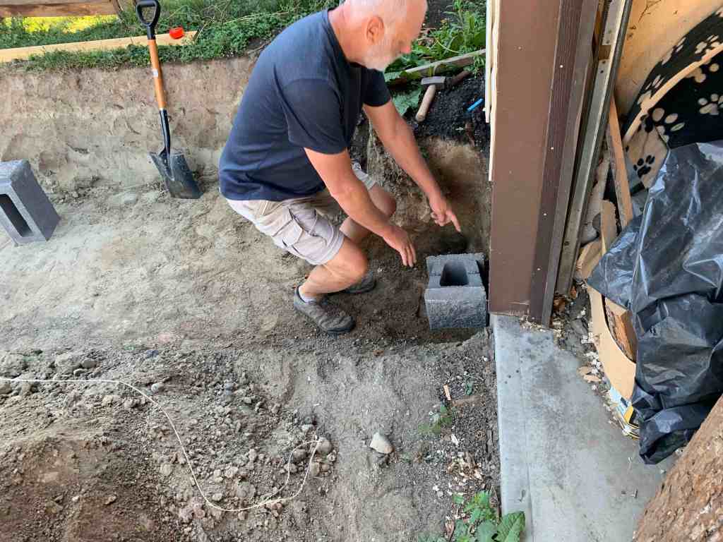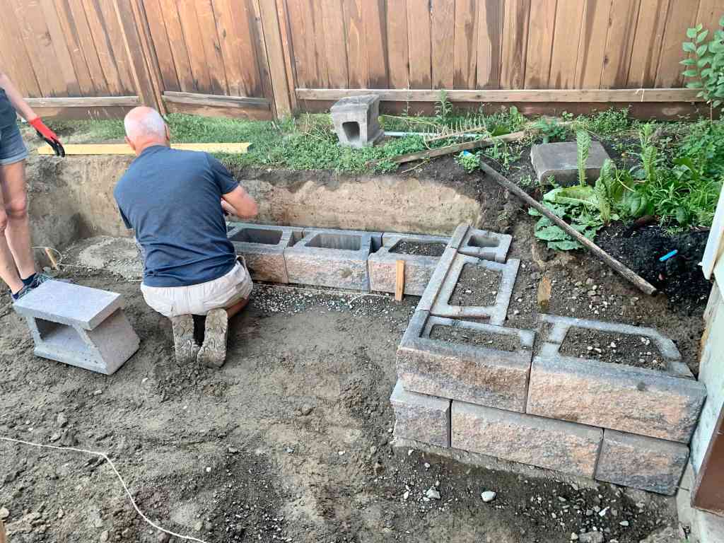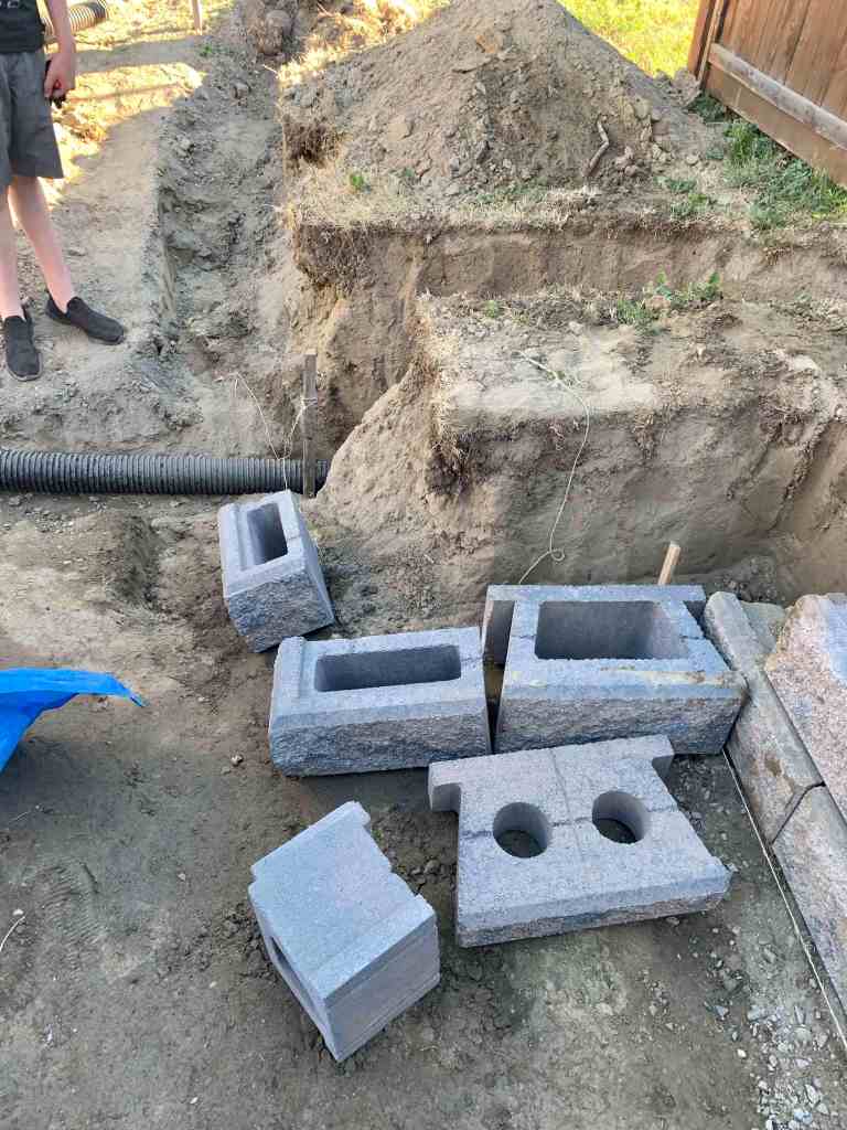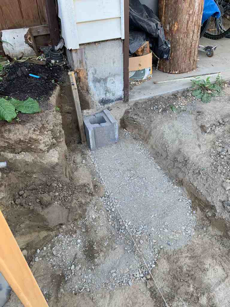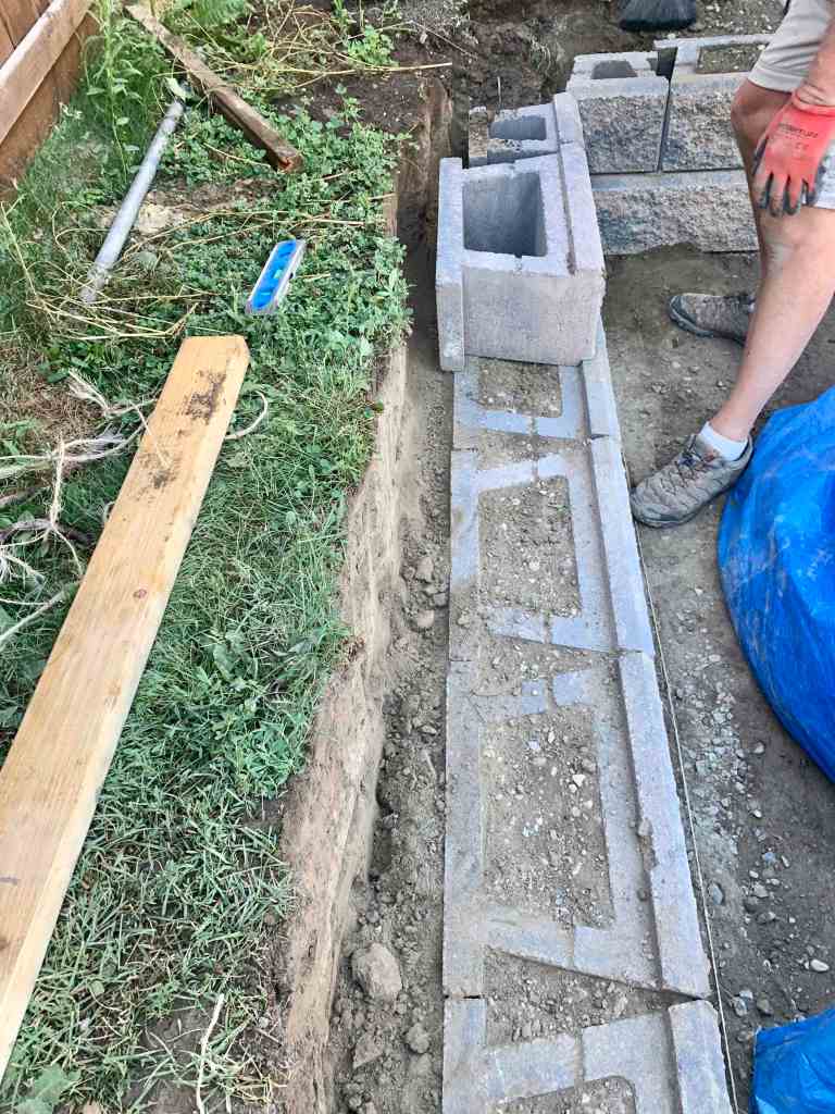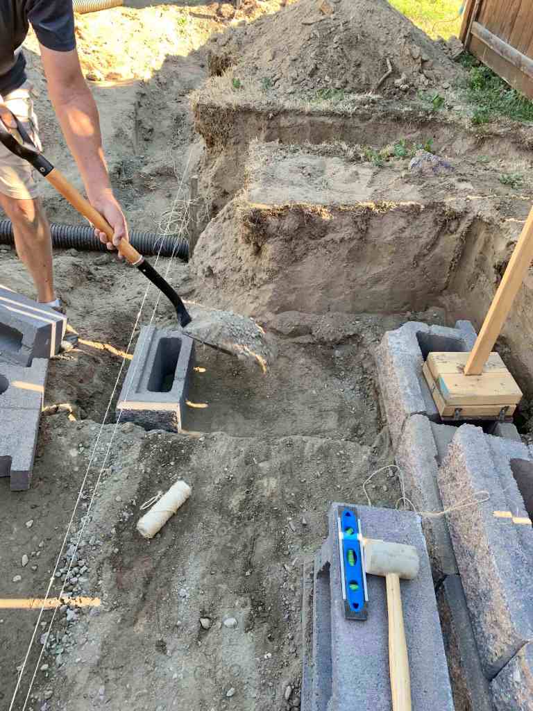 The wall that I helped with, was a little more complicated. It goes a little deeper since dad wants a bit of a slope to the new drainage grates he is putting in. As well as that, he had a great idea of adding a little nook to the wall to store the garbage & recycling bin so that they are not in the way and have a little home. The nook would also have a stair or two leading up to the backyard fence gate.